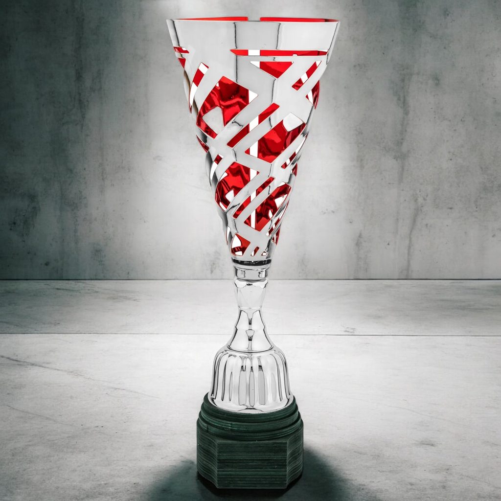 The Caesar Silver & Red Championship Trophy is a bold, high-impact award designed to celebrate top-level achievement. Featuring a laser-cut silver metal cone with striking red detailing, this impressive trophy is mounted on a sculpted riser and finished on a handcrafted real birch wood base.