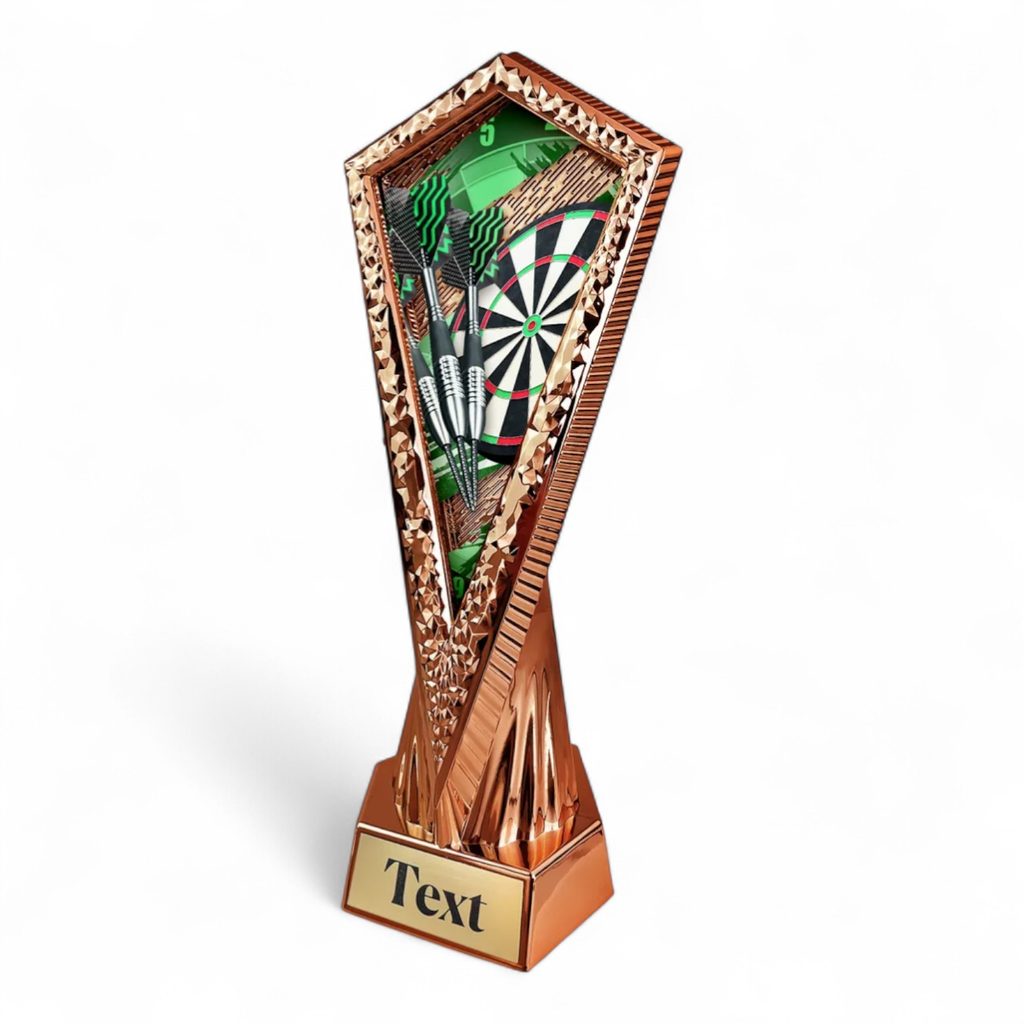 The centrepiece is a high-quality printed acrylic panel, showcasing sharp darts-themed visuals—from dartboards and flight patterns to scoring elements. This insert slots perfectly into the front, giving the trophy its sculpted, cohesive appearance.