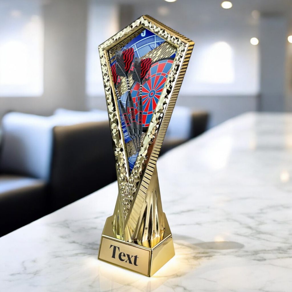 At its centre is a high-quality printed acrylic panel, featuring bright and dynamic digital darts imagery—showing illuminated dartboards, score readouts, and arcade-style effects. The insert slots flawlessly into the front, giving the trophy a polished, unified look.