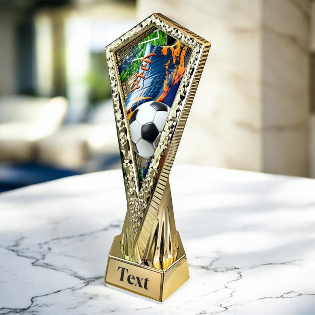 Celebrate every football triumph in style with the Apex Heavyweight Football Trophy – a bold 270mm design available in gold, silver or bronze. Featuring a high-quality printed acrylic panel with dynamic football artwork that slots seamlessly into the front, it creates the look of a single sculpted award. With its glossy finish and solid heavyweight feel, it’s ideal for all formats of football, from grassroots matches to tournament finals. Exclusive to Trophy Monster, this trophy also includes a free engraved plate.