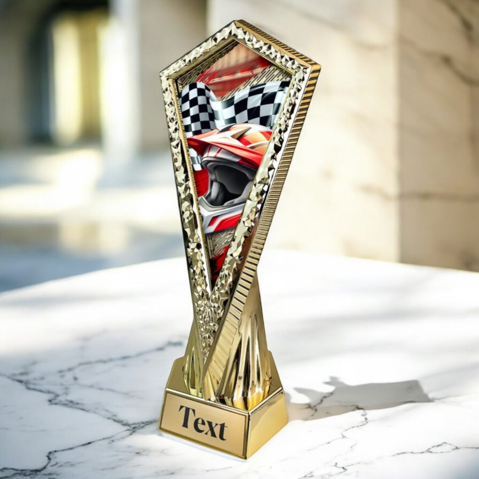 At the heart of the design is a high-quality printed acrylic panel, packed with powerful motocross graphics—riders in mid-air, dirt trails, and helmeted figures in motion—designed to reflect the raw intensity of the sport. This insert slots cleanly into the front, giving the trophy its sculpted, unified appearance.