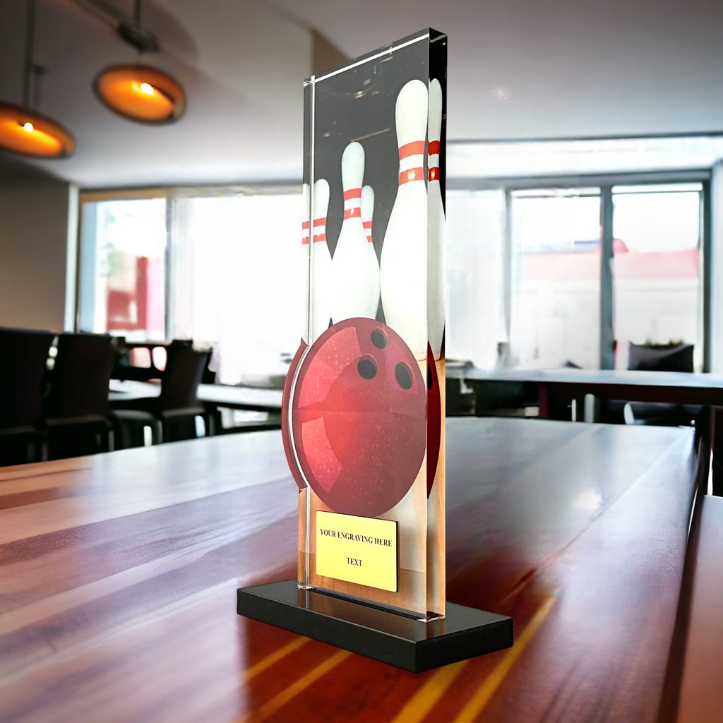 The Apla Tenpin Bowling Ball And Pins Trophy is a bold and modern award, designed to make a lasting impression.