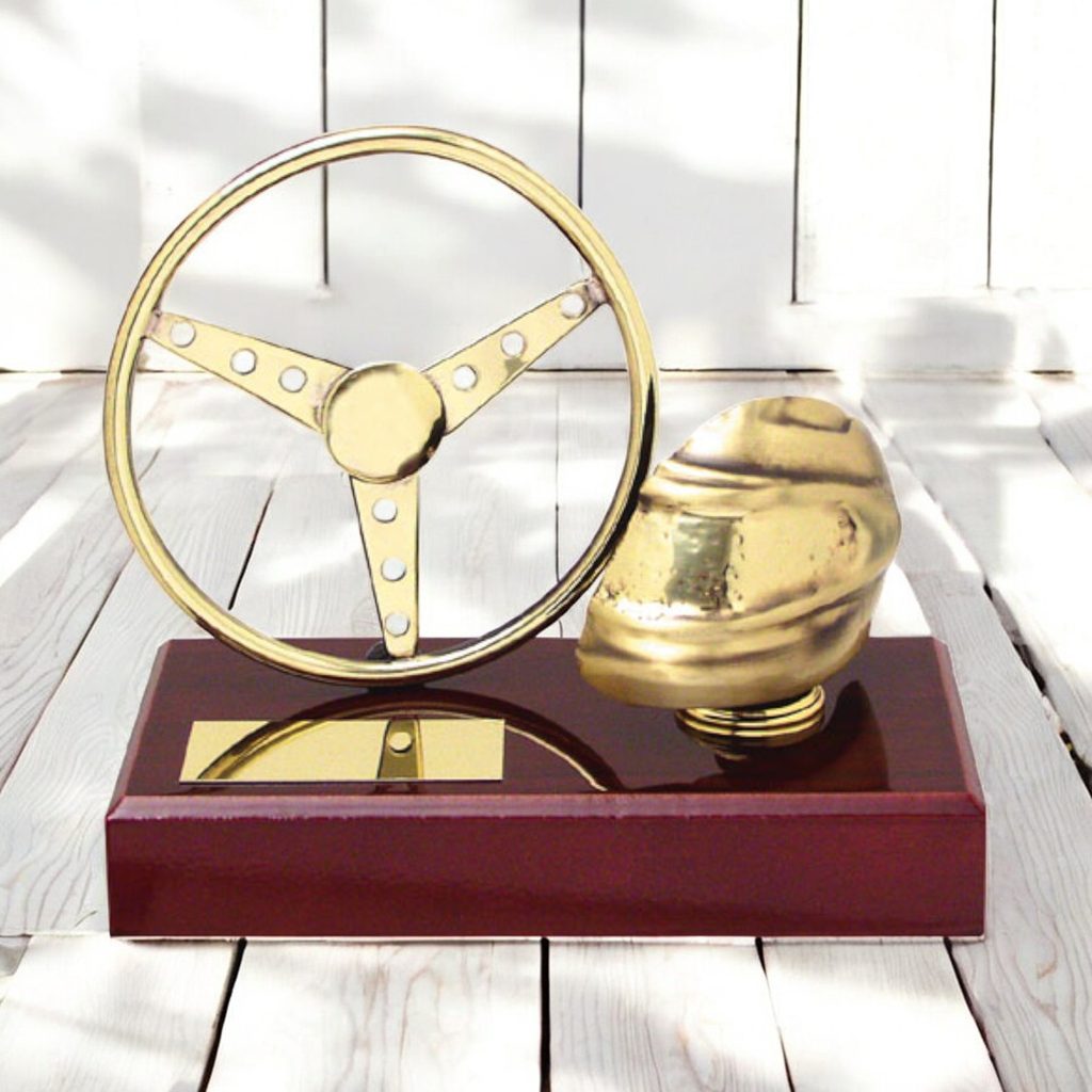 Introducing the refined Aragon Motorsports Trophy, a meticulously crafted award symbolising the thrill and precision of racing. This unique piece showcases a stylised racing steering wheel and helmet, beautifully mounted on a wide rectangular wooden base, adding a sense of sophistication to any display.