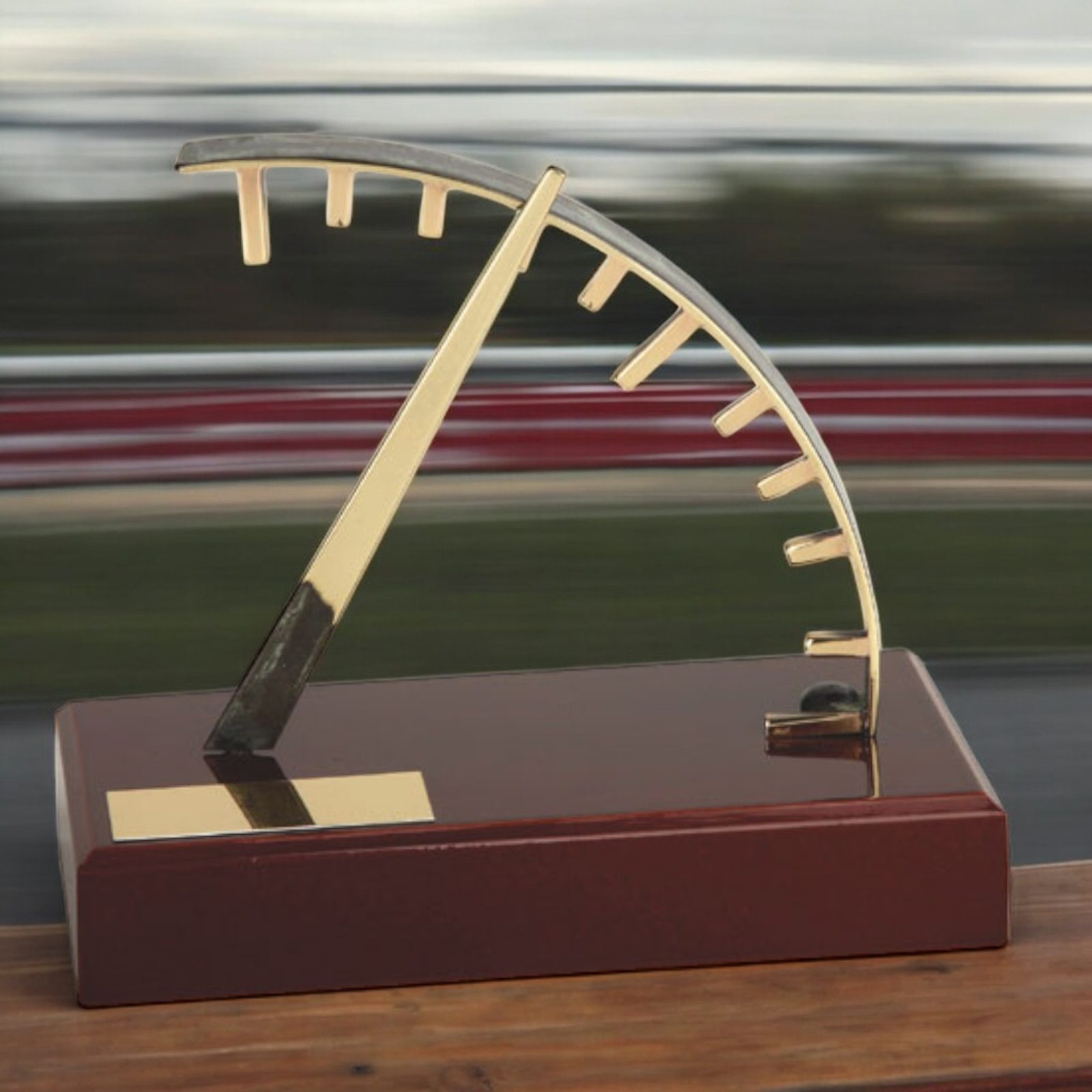 Introducing the distinguished Aragon Motorsports Speedometer Trophy, a meticulously handcrafted metal award that embodies elegance and dynamism. This exclusive trophy features a sleek speedometer design, symbolising the thrill and precision of motorsports, all set atop a polished wooden platform for a striking visual impact.