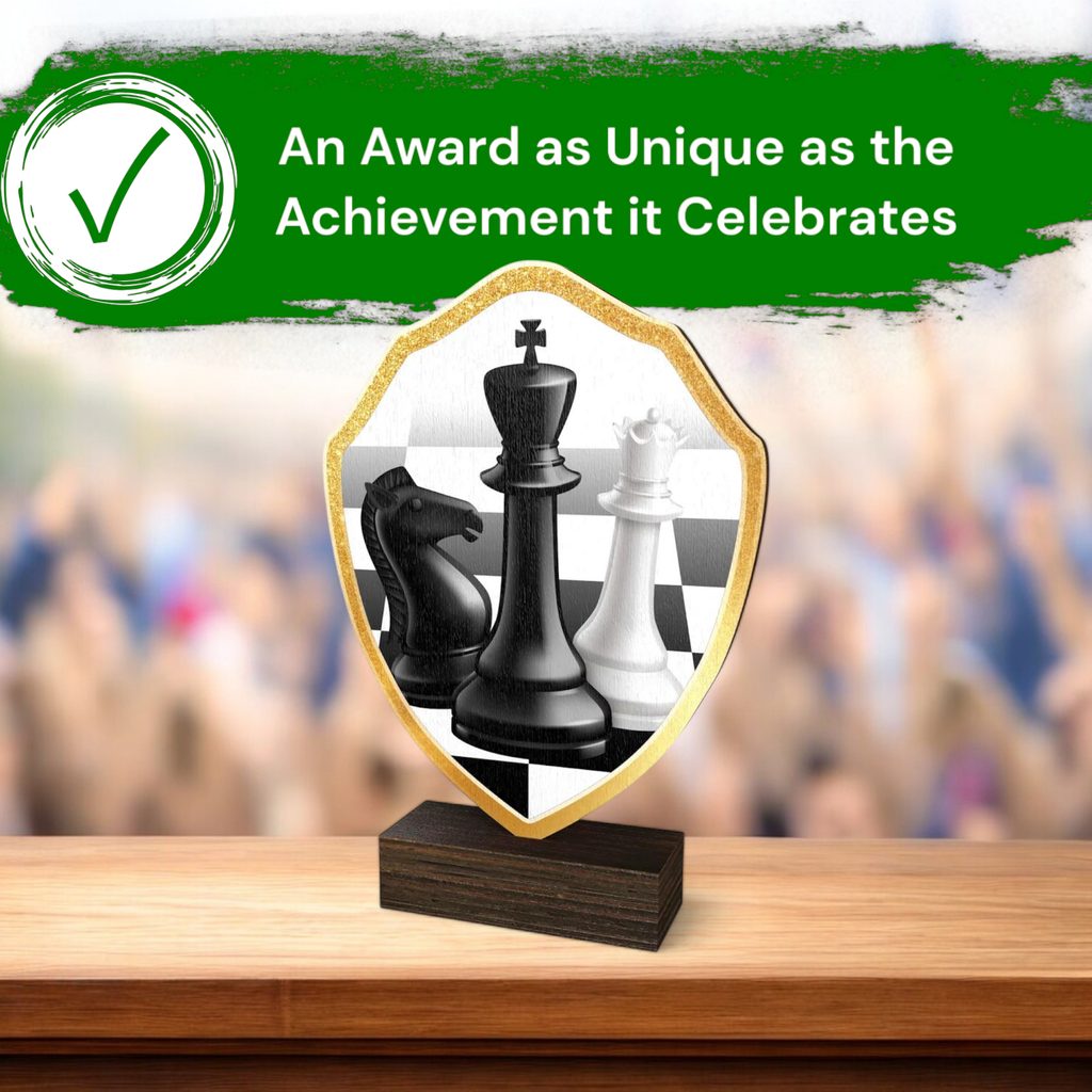 The Arden Chess Real Wood Shield Trophy is a stylish and eco-friendly award, combining sustainability with premium craftsmanship.