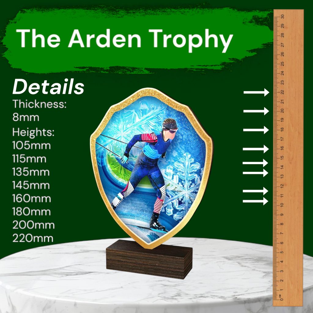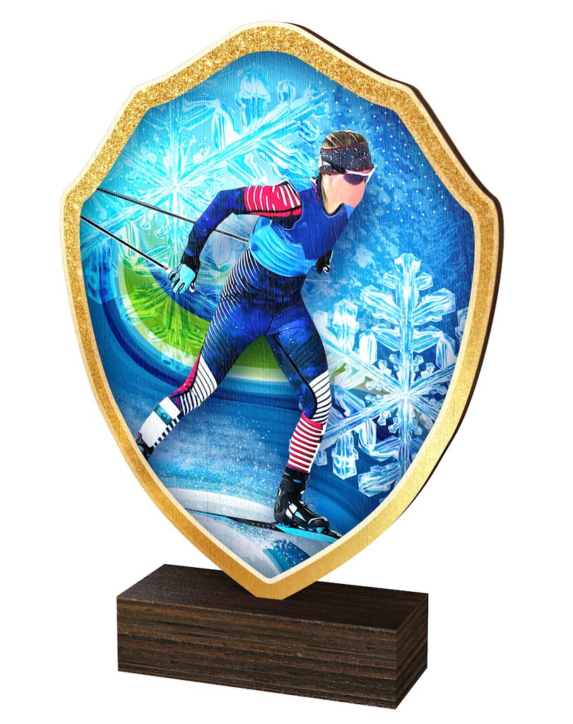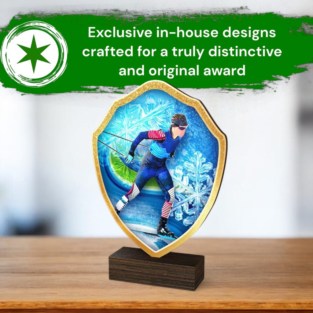 The Arden Cross-Country Skiing Real Wood Shield Trophy is a stylish and eco-friendly award, combining sustainability with premium craftsmanship.