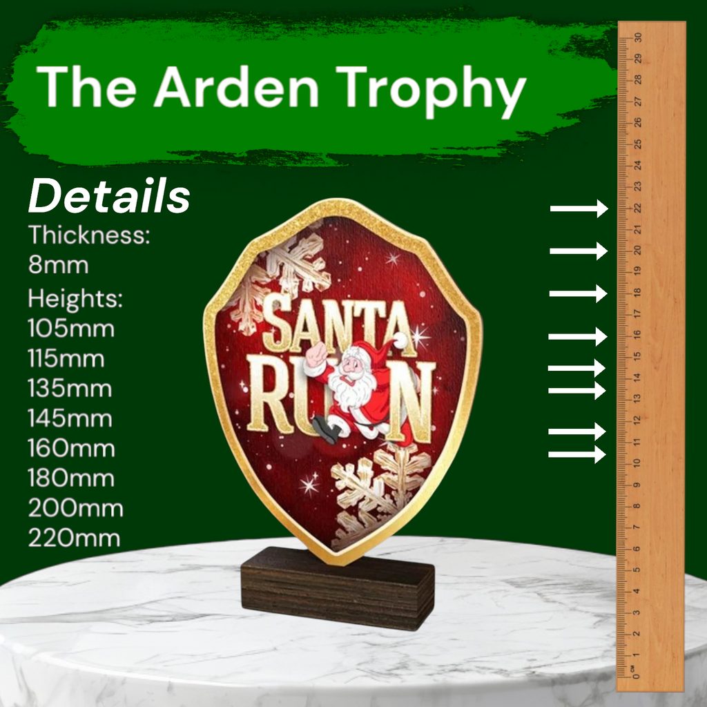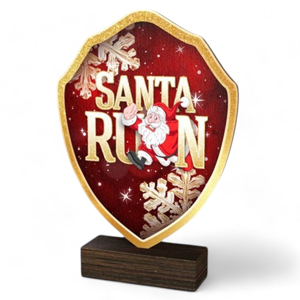 The Arden Dasher Santa Run Real Wood Shield Trophy is a stylish and eco-friendly award, combining sustainability with premium craftsmanship.