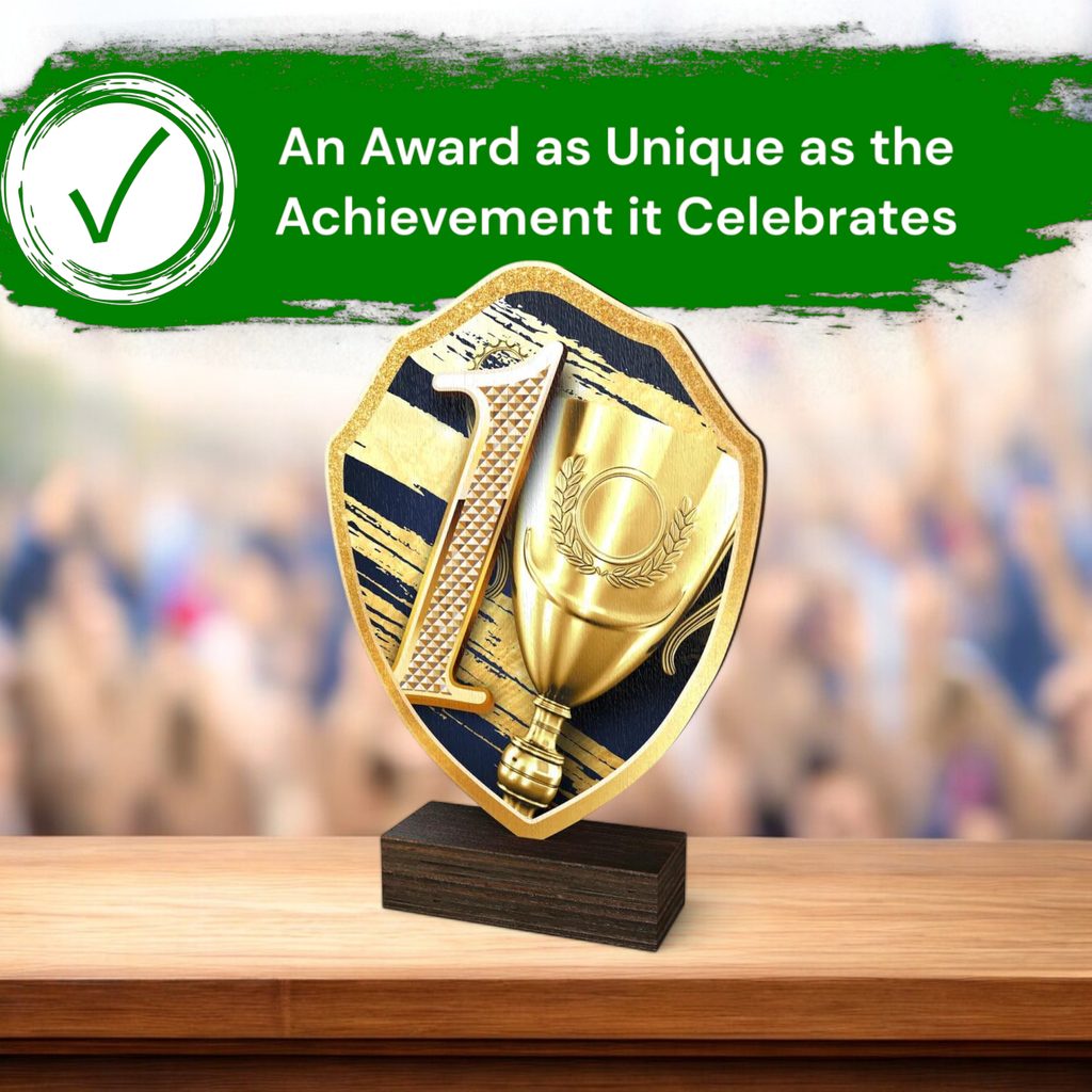The Arden First Place Real Wood Shield Trophy is a stylish and eco-friendly award, combining sustainability with premium craftsmanship.