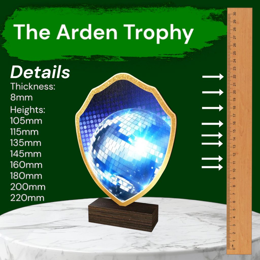 The Arden Glitterball Blue Real Wood Shield Trophy is a stylish and eco-friendly award, combining sustainability with premium craftsmanship.