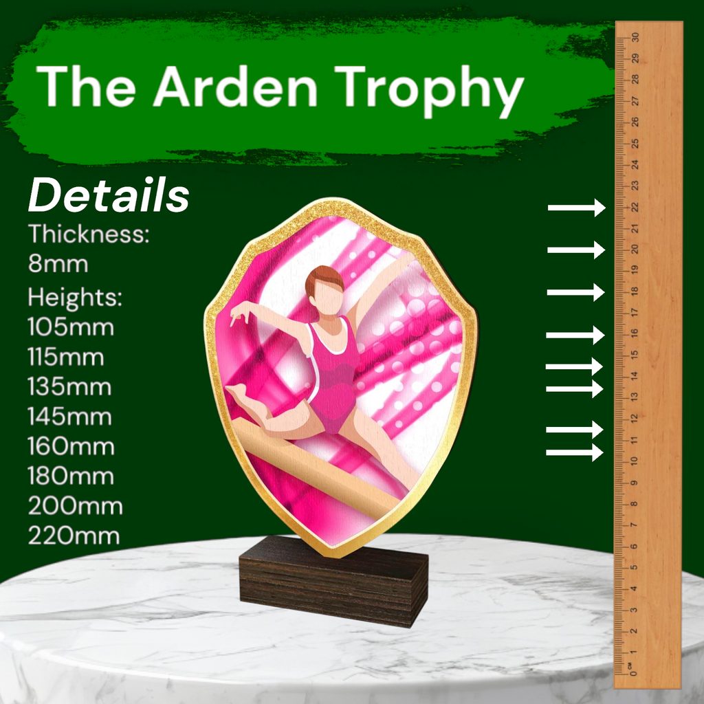 The Arden Gymnastics Female Real Wood Shield Trophy is a stylish and eco-friendly award, combining sustainability with premium craftsmanship.