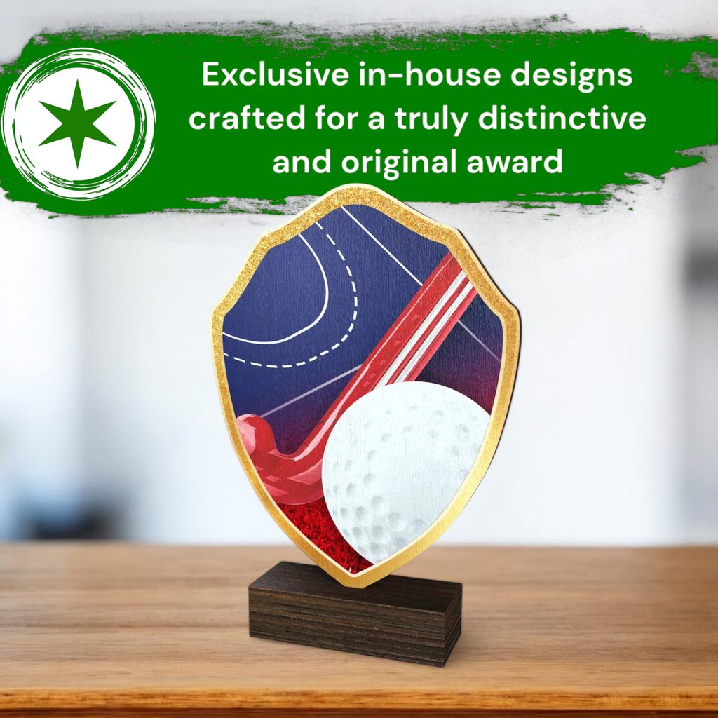 The Arden Hockey Real Wood Shield Trophy is a stylish and eco-friendly award, combining sustainability with premium craftsmanship.