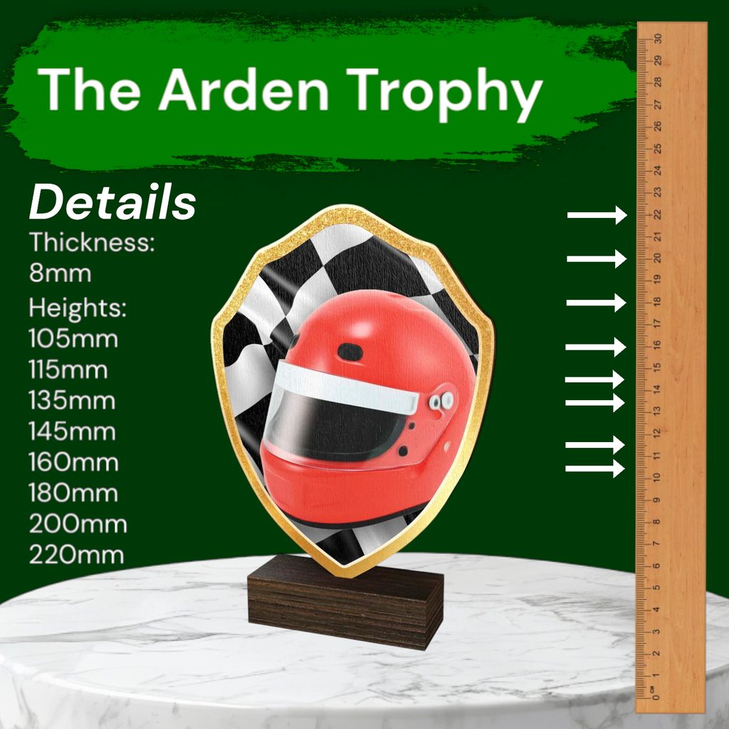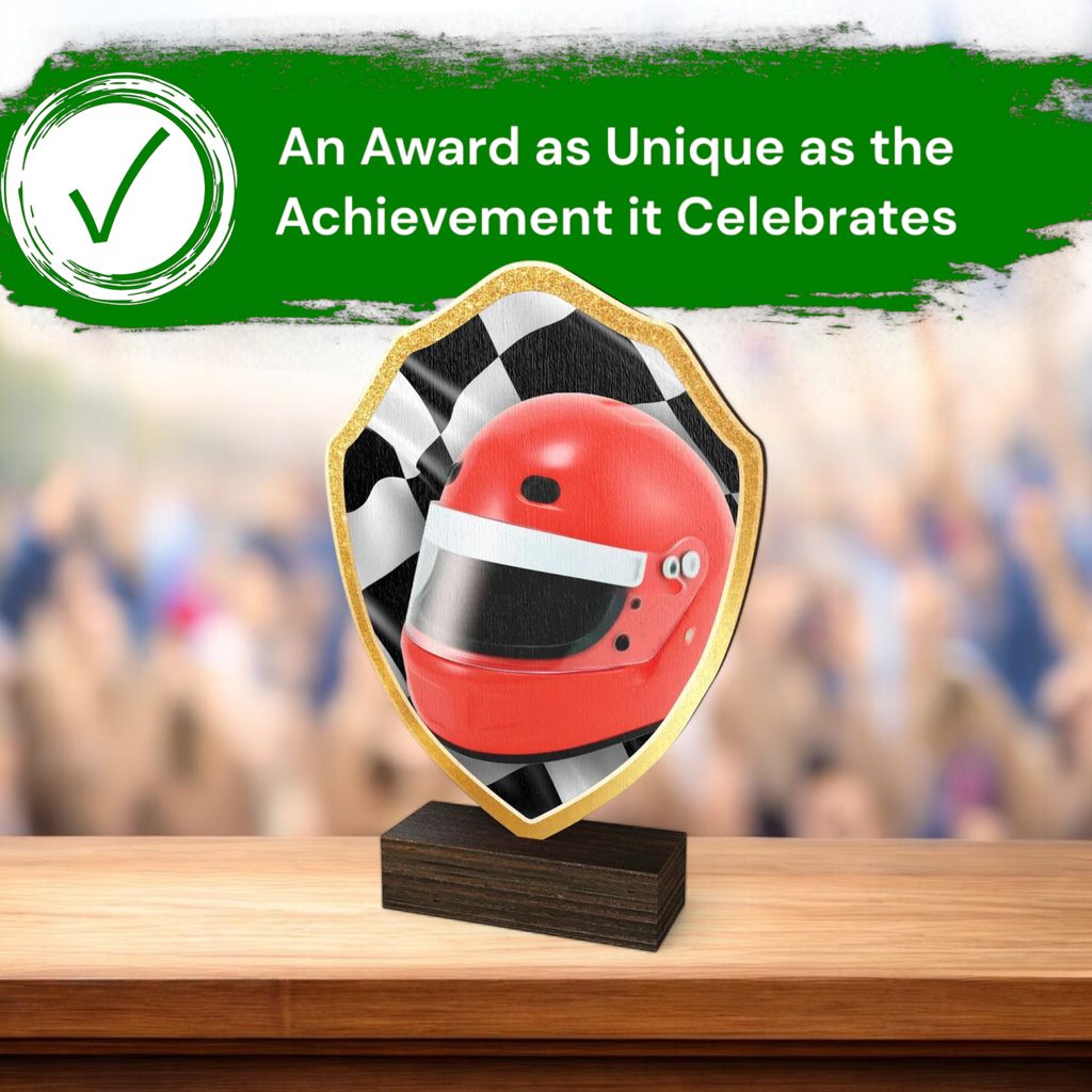 The Arden Motor Racing Helmet Real Wood Shield Trophy is a stylish and eco-friendly award, combining sustainability with premium craftsmanship.
