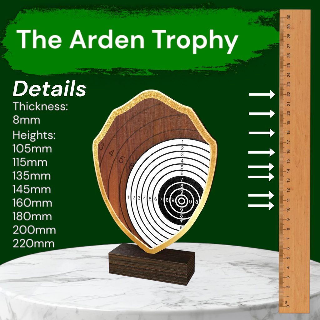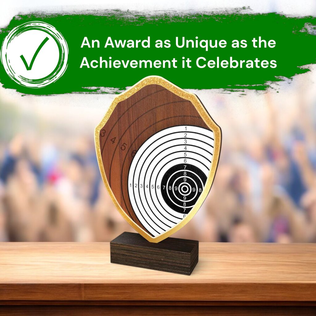 The Arden Shooting Target Real Wood Shield Trophy is a stylish and eco-friendly award, combining sustainability with premium craftsmanship.