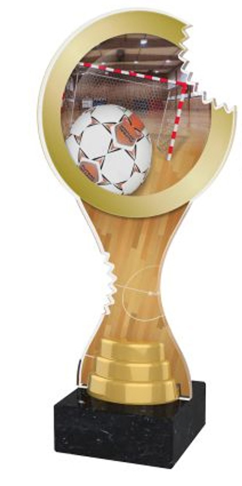 The Athens Futsal Indoor Football Trophy is contemporary artistic award. Cut to shape this trophy comes to life with a high quality full colour print that is double sided on the 6mm thick acrylic. The award is mounted on a heavy black marble base.