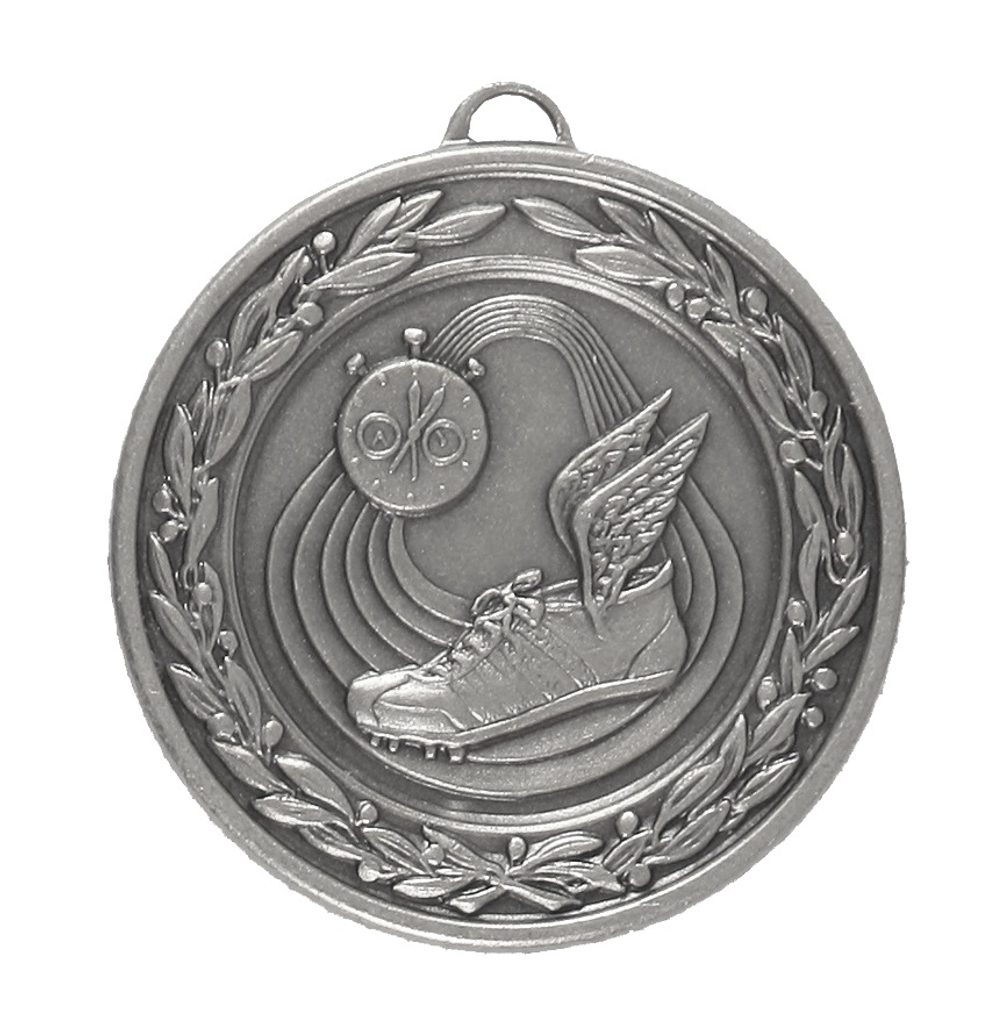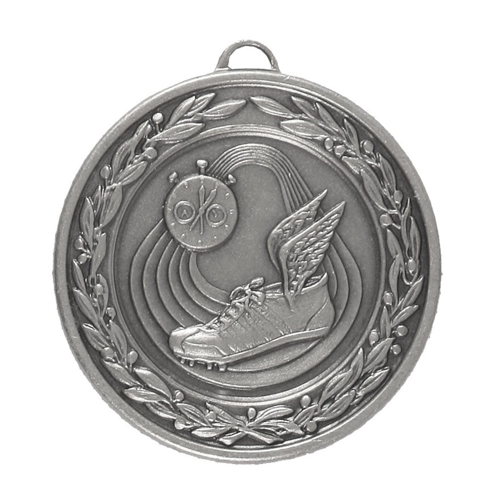 A high quality embossed silver metal athletics running medal displaying a running shoe, stopwatch & running track within a laurel design. The diameter is 50mm and the thickness is 3mm giving the medal a heavy feel. This medal can be engraved on the reverse and comes complete with a loop to accommodate a ribbon.