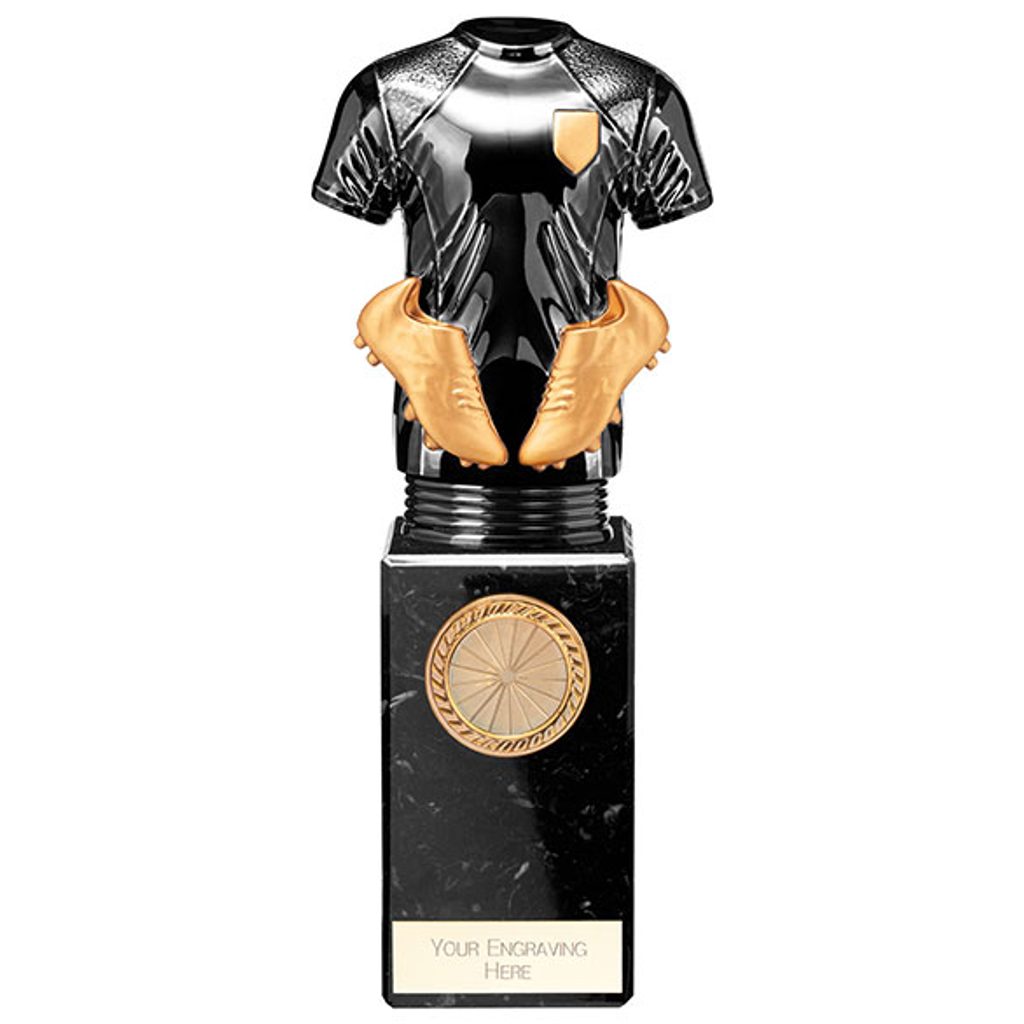 The Black Viper Legend Football Trophy is an exciting new design made from top quality plastic. Glazed in a standout metallic black finish, with gold detailing, mounted on a black marble base.