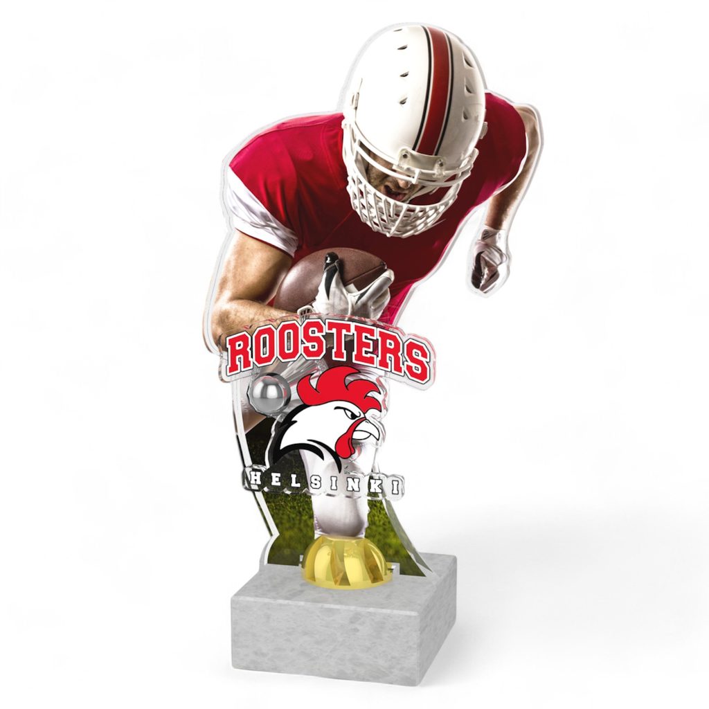 The Brady Custom Made American Football Award is the champion of in-design trophies. The acrylic centrepeice is cut to shape and fixed either side by a gold or silver holder. The player can be branded to your clubs colours. We then fix a second acrylic logo piece cut to shape which is screwed onto the front. This is then mounted onto a heavyweight white marble base.