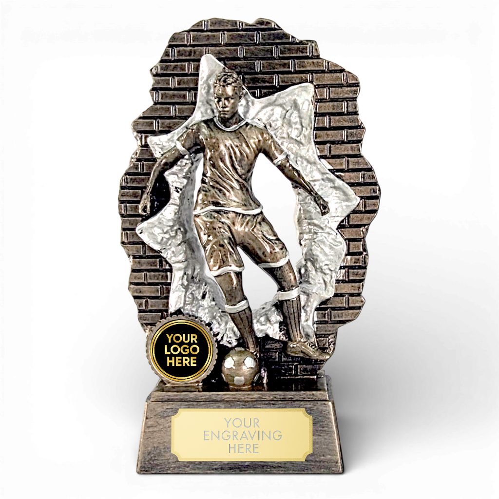 The Breakthrough Resin Football Trophy is a powerful sculpted award from the Trophy Monster Heritage Resin Collection, designed to capture the determination and momentum of the modern game. Featuring a footballer bursting through a brick wall with ball in hand, this trophy symbolises strength, commitment and the drive to break through the opposition.