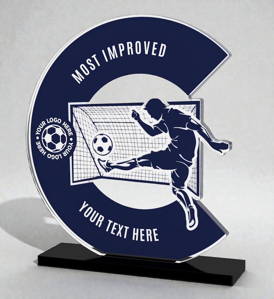 The Cantu Deluxe Custom Printed Most Improved Football Trophy is a sleek, contemporary award designed to celebrate dedication, development and progress across the season. Crafted from premium 6mm thick acrylic and mounted on a solid black base, this modern trophy delivers a clean, professional finish ideal for club and seasonal presentations.