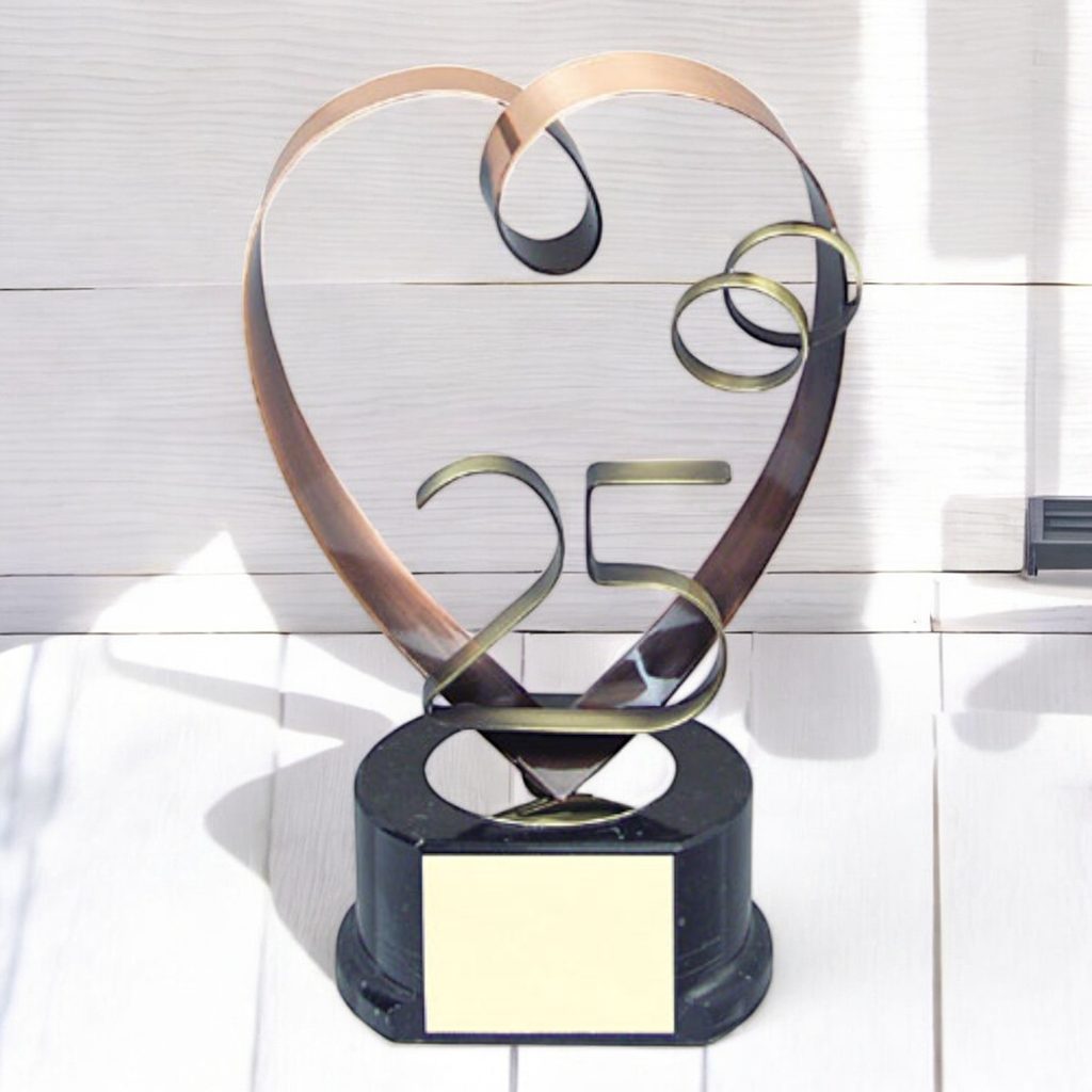 Introducing the Caseda 25 Years Anniversary Trophy—an exclusive, handcrafted award that beautifully commemorates a quarter-century milestone. This elegant design features a sculpted metal heart embracing the number "25" in a refined display of artistry and celebration. The piece is mounted on a polished marble effect wooden base, adding a touch of timeless sophistication.