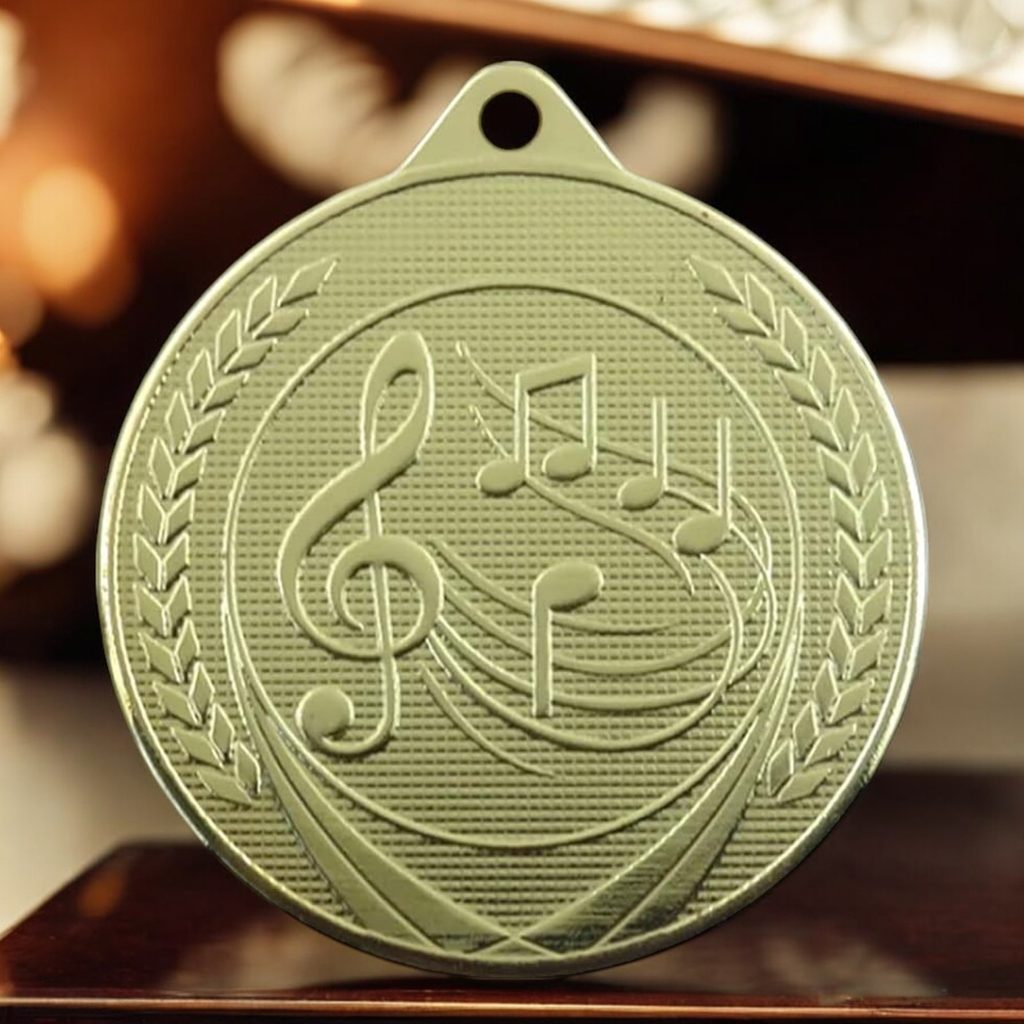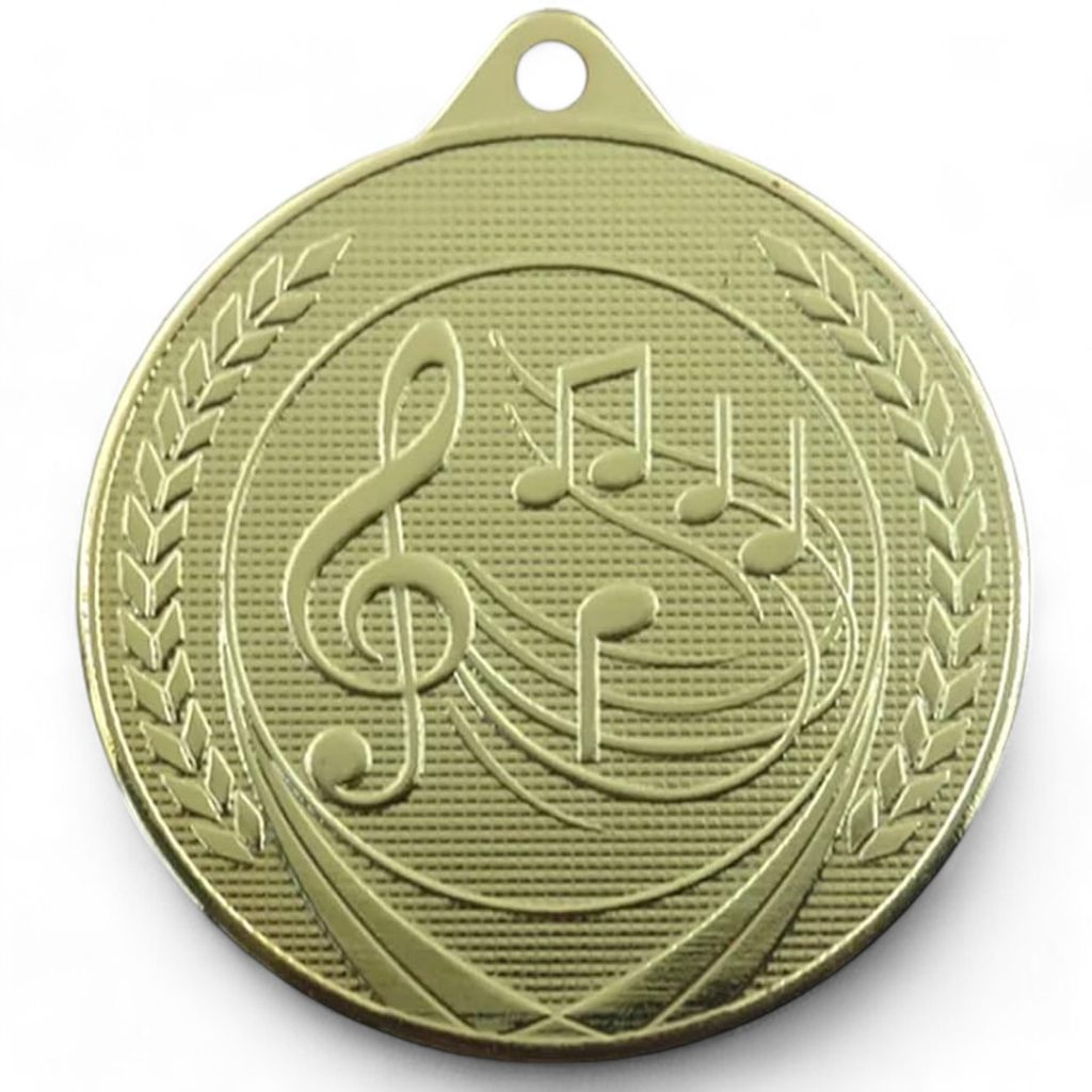 Elevate your music achievements with this exquisite embossed gold metal medal featuring musical notes and net surrounded by a laurel design. The medal boasts a diameter of 50mm and a thickness of 2.5mm, providing a substantial and luxurious feel.