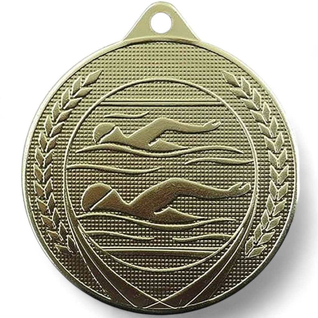 Elevate your swimming achievements with this exquisite embossed gold metal unisex medal featuring a swimmers surrounded by a laurel design. The medal boasts a diameter of 50mm and a thickness of 2.5mm, providing a substantial and luxurious feel.