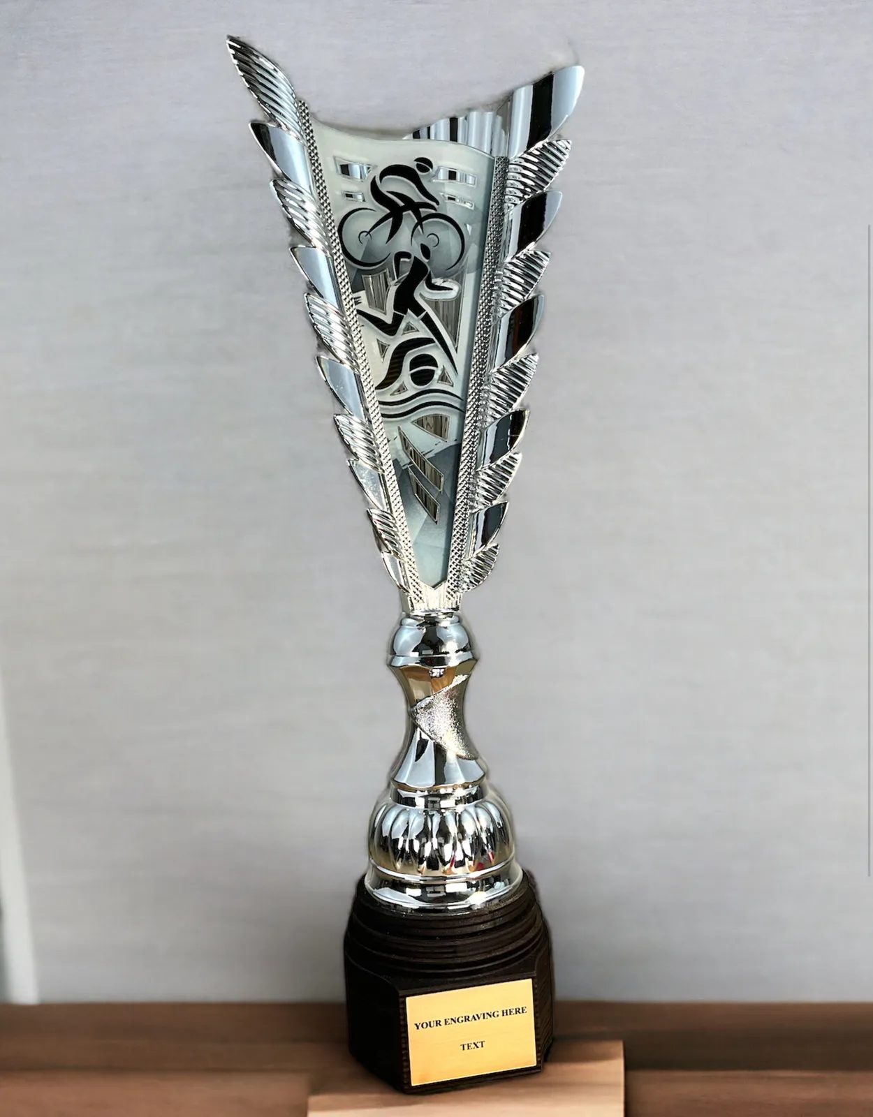 The Chester Silver Trophy is a modern design featuring a unique printed acrylic specially shaped insert. This award is available in three sizes and boasts a striking, glamorous bright silver thick plastic body. The acrylic printed strip inserts through the front of the trophy, offering a choice of antique gold, silver, or bronze finish, as well as a full-colour option.