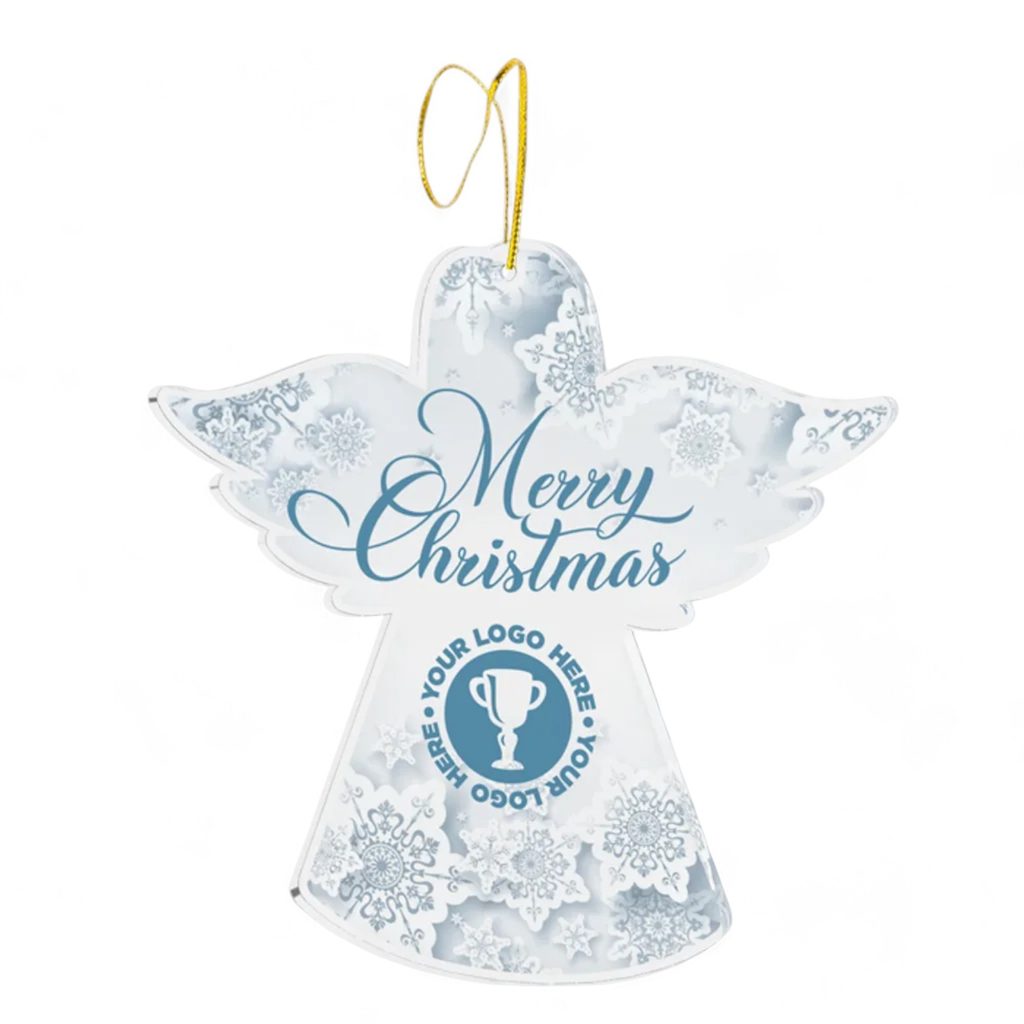 Introducing the custom-made Angel Christmas tree ornament, a truly unique addition to your holiday decor. This ornament comes complete with a gold hanging cord, making it easy to display. Best of all, there are no set-up or origination charges.