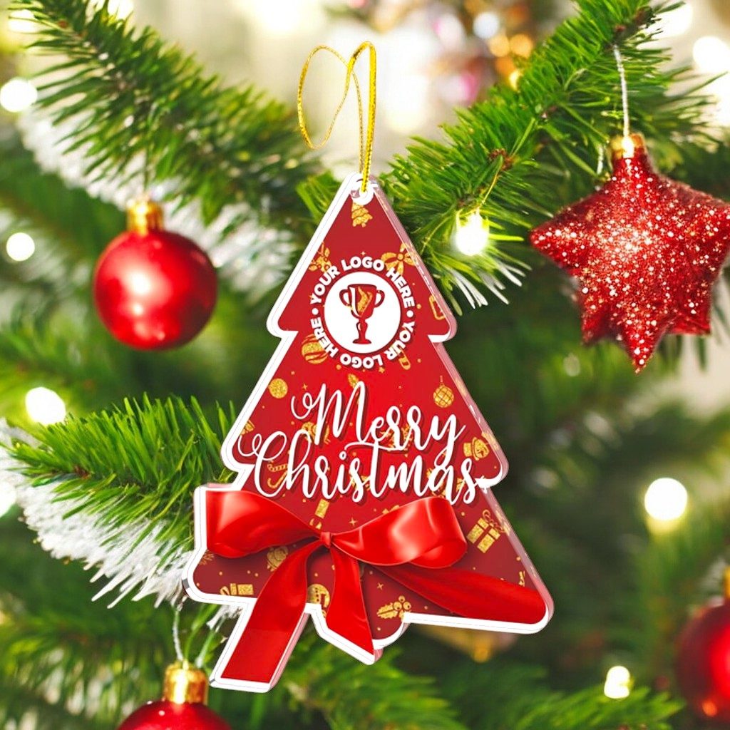 Introducing the custom-made Christmas Ribbon Logo Tree ornament, a truly unique addition to your holiday decor. This ornament comes complete with a gold hanging cord, making it easy to display. Best of all, there are no set-up or origination charges.