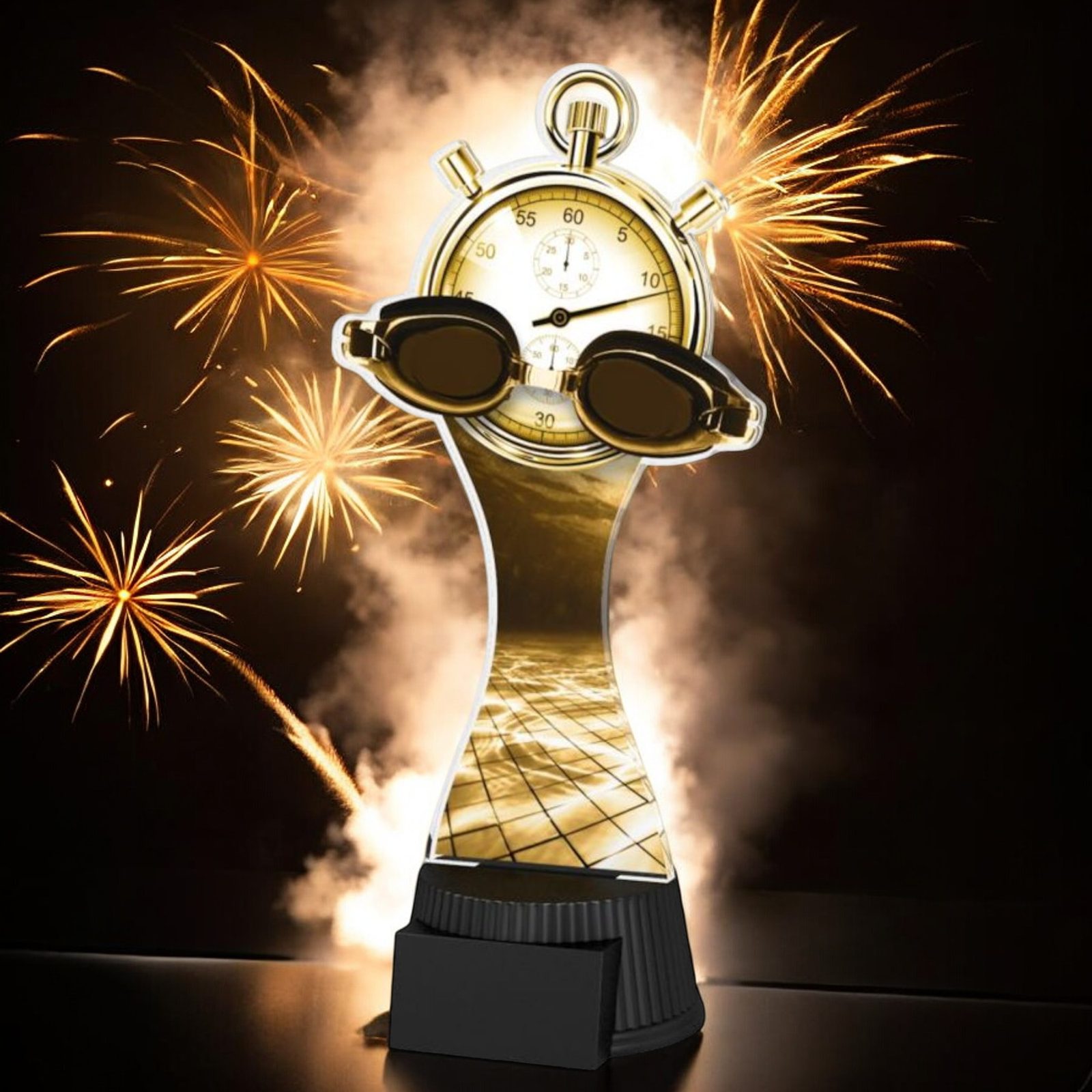 The Toronto Swimming Goggles and Stopwatch Trophy is a sleek and contemporary award, designed to make a bold statement at any presentation. With its modern silhouette and eye-catching design, this trophy is the perfect way to honour outstanding achievements in sports, business, and beyond.