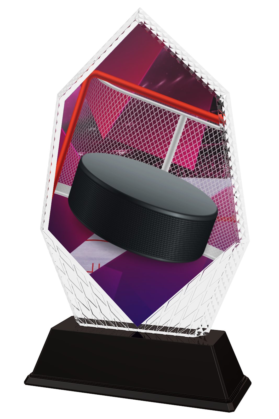 The Cleo Ice Hockey Goal Trophy has been developed using a special patterned 8mm acrylic mounted on a black PVC base. The feature of the Cleo range is its unique pink and purple based high quality print.