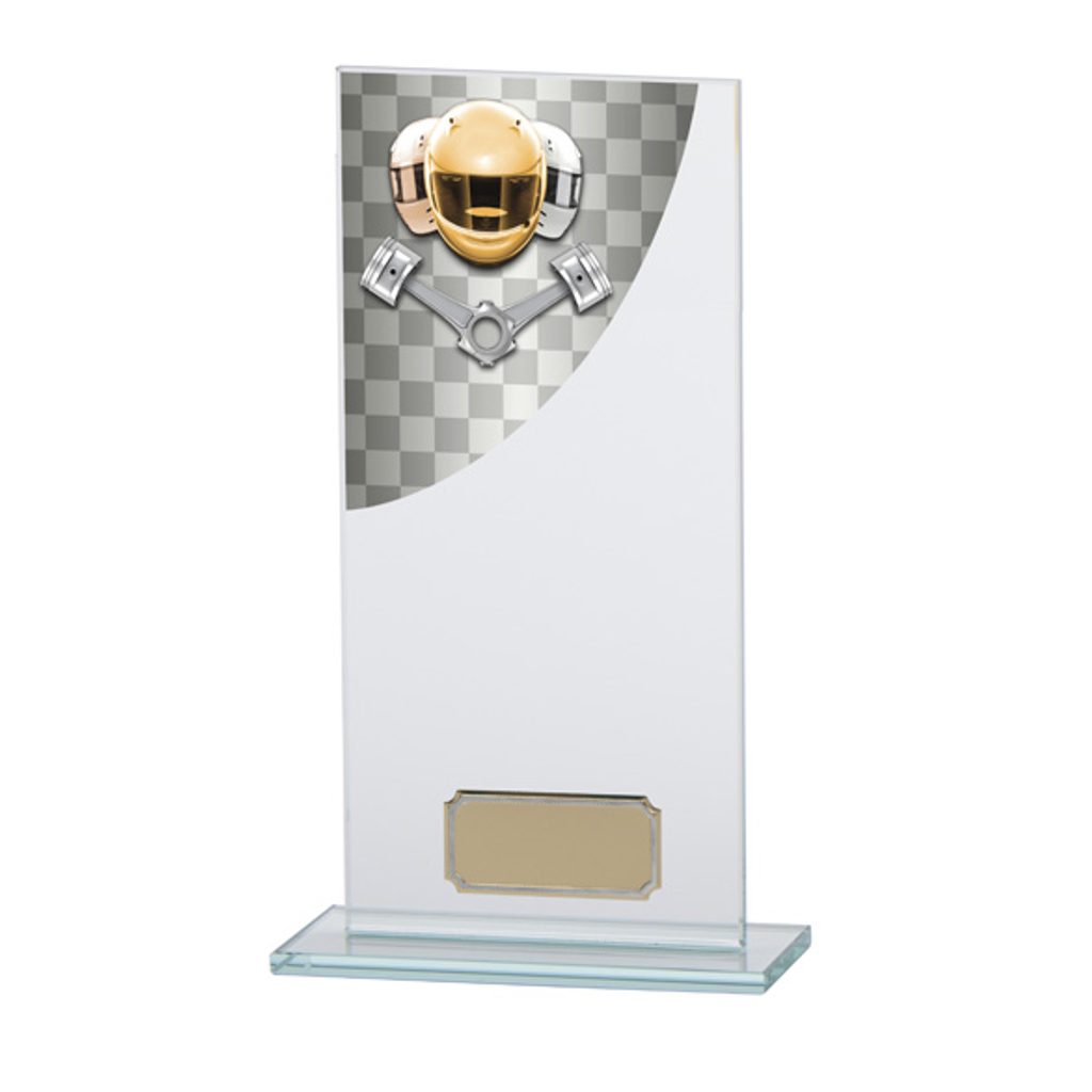 The Colour Curve Jade Glass Motorsports Trophy is a brilliant 5mm jade glass award; feautring a fantastic full colour pistons and helmets printed design.