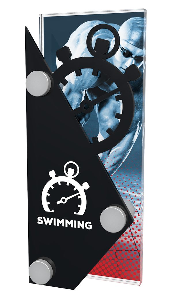 The Cordoba Male Swimmer Trophy is made from two pieces of acrylic. These are connected by using three steel screw fittings. The back piece is a 10mm thick piece of high quality printed acrylic, and the front piece is laser cut black acrylic.