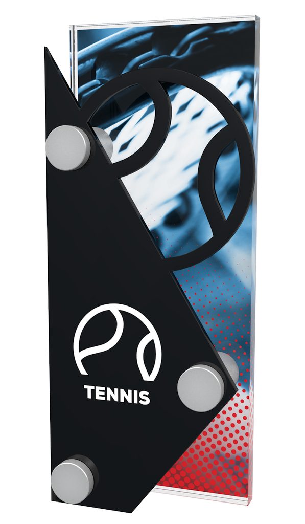 The Cordoba Tennis Trophy is made from two pieces of acrylic. These are connected by using three steel screw fittings. The back piece is a 10mm thick piece of high quality printed acrylic, and the front piece is laser cut black acrylic.