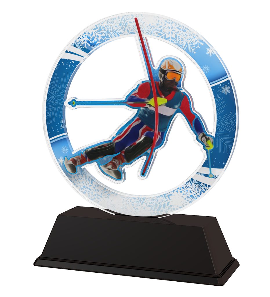 The Cortina Skiing Trophy is the latest in design. Cut out to shape this trophy comes to life with a high quality full colour print on the reverse side of the 4mm thick acrylic mounted on a black PVC base.