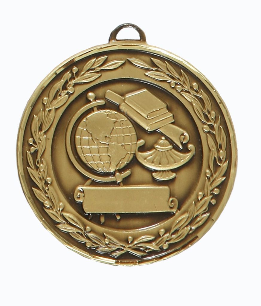 A top quality embossed diamond edged bronze academic knowledge medal made from brass. The medal displays a globe and other academic symbols. The diameter is 50mm and the thickness is 3mm giving the medal a heavy feel. This medal can be engraved on the reverse and comes complete with a loop to accomadate a ribbon.