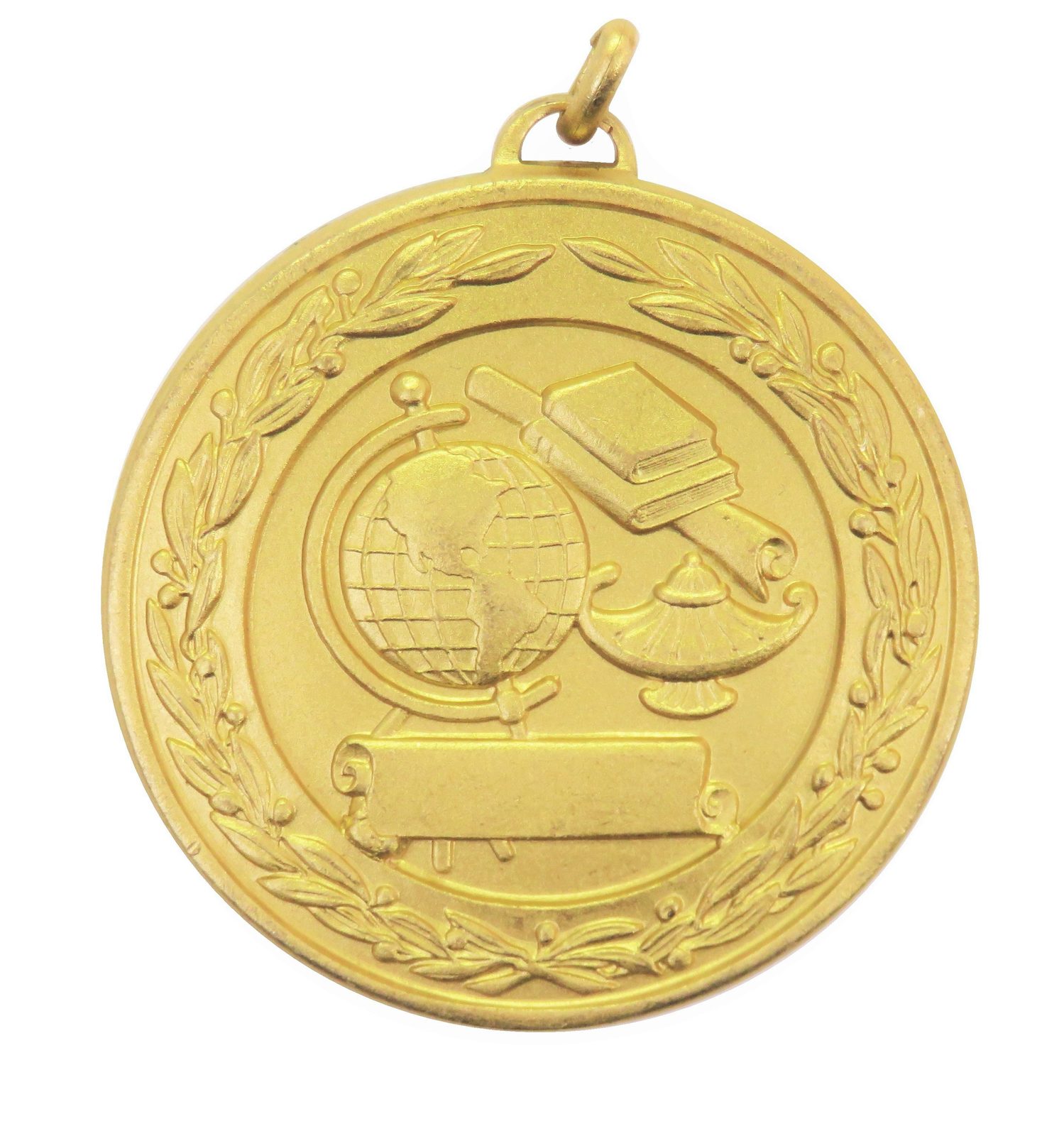 A top quality embossed diamond edged gold academic knowledge medal made from brass. The medal displays a globe and other academic symbols. The diameter is 50mm and the thickness is 3mm giving the medal a heavy feel. This medal can be engraved on the reverse and comes complete with a loop to accomadate a ribbon.