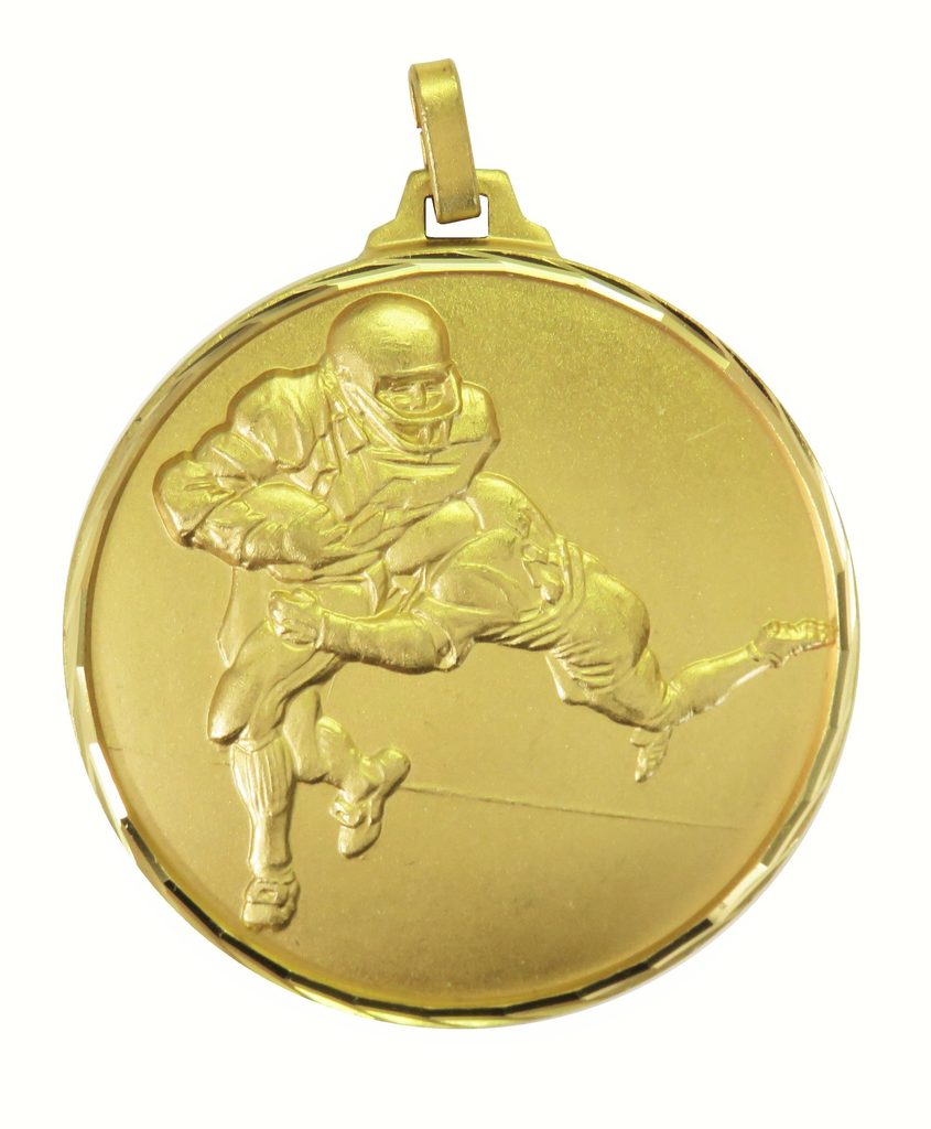 A top quality embossed diamond edged gold amercian football medal made from brass. The medal displays two players in action. The diameter is 52mm and the thickness is 3mm giving the medal a heavy feel. This medal can be engraved on the reverse and comes complete with a loop to accomadate a ribbon.