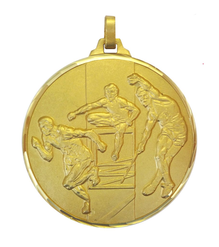 A top quality embossed diamond edged gold track & field medal made from brass. The medal displays running, hurdles and javelin events in action. The diameter is 52mm and the thickness is 3mm giving the medal a heavy feel. This medal can be engraved on the reverse and comes complete with a loop to accomadate a ribbon.