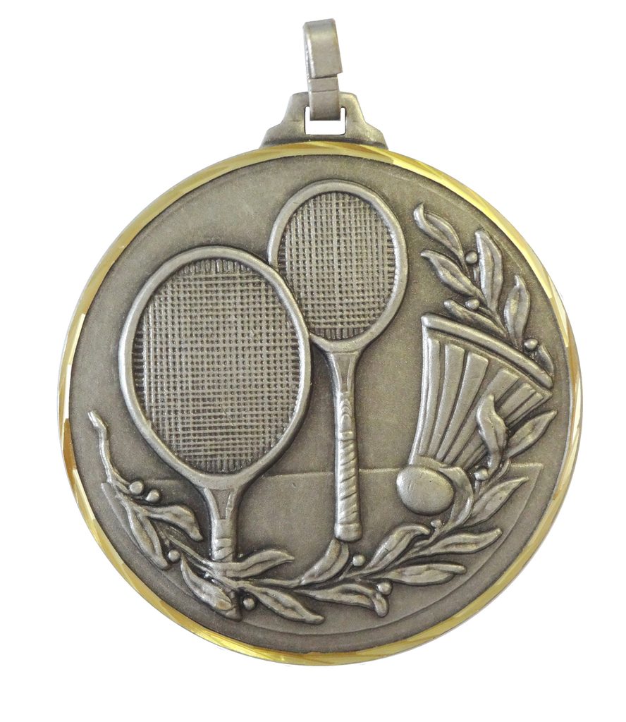 A top quality embossed diamond edged silver badminton medal made from brass. The medal displays badminton rackets and a shuttlecock. The diameter is 52mm and the thickness is 3mm giving the medal a heavy feel. This medal can be engraved on the reverse and comes complete with a loop to accomadate a ribbon.