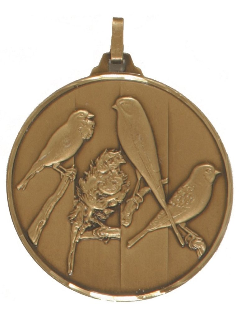 A top quality embossed diamond edged bronze bird fancier medal made from brass. The medal displays various birds such as the canary. The diameter is 52mm and the thickness is 3mm giving the medal a heavy feel. This medal can be engraved on the reverse and comes complete with a loop to accomadate a ribbon.