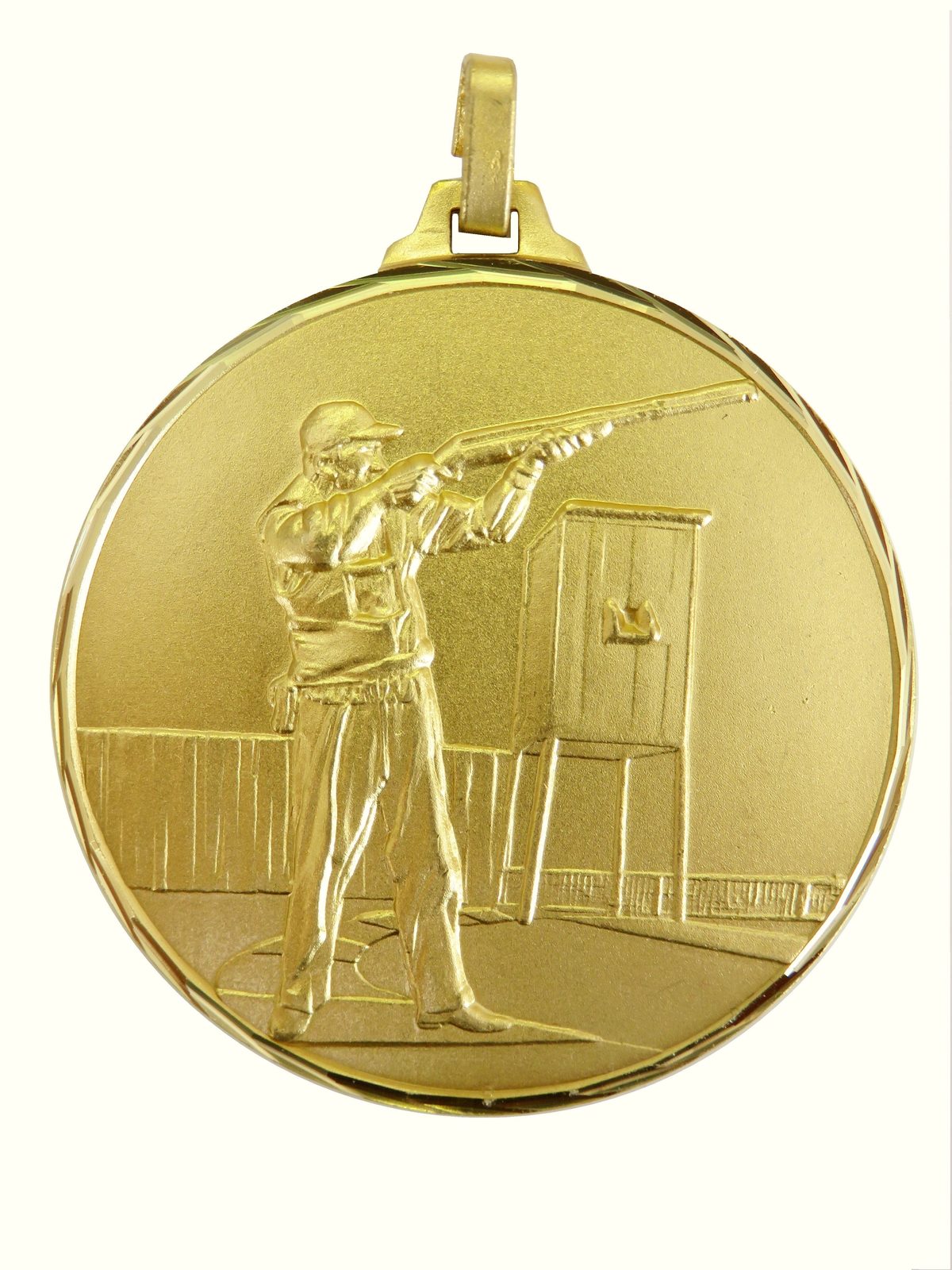 A top quality embossed diamond edged gold clay pigeon shooting skeet medal made from brass. The medal displays a clay pigeon shooter in action with his rifle. The diameter is 52mm and the thickness is 3mm giving the medal a heavy feel. This medal can be engraved on the reverse and comes complete with a loop to accomadate a ribbon.