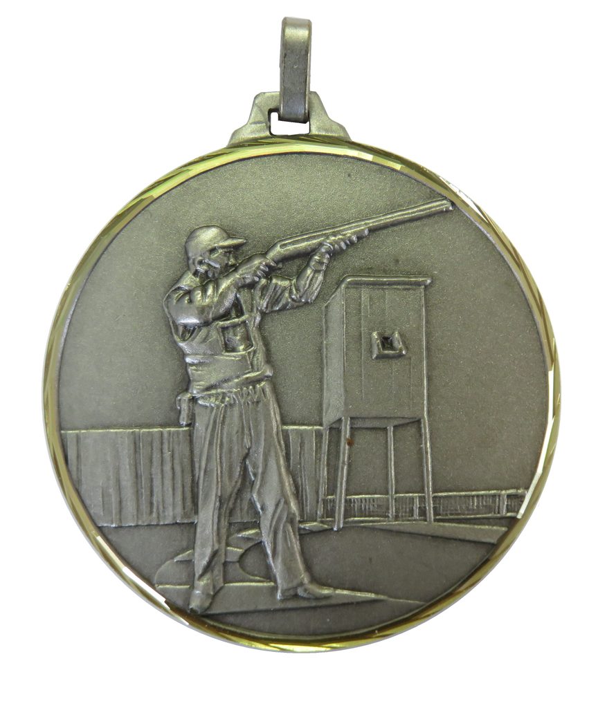 A top quality embossed diamond edged silver clay pigeon shooting skeet medal made from brass. The medal displays a clay pigeon shooter in action with his rifle. The diameter is 52mm and the thickness is 3mm giving the medal a heavy feel. This medal can be engraved on the reverse and comes complete with a loop to accomadate a ribbon.