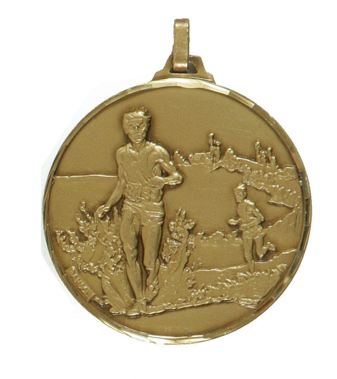 A top quality embossed diamond edged bronze cross country running medal made from brass. The medal displays runners in action. Select from 42mm or 52mm diameter and the thickness is 3mm giving the medal a heavy feel. This medal can be engraved on the reverse and comes complete with a loop to accomadate a ribbon.