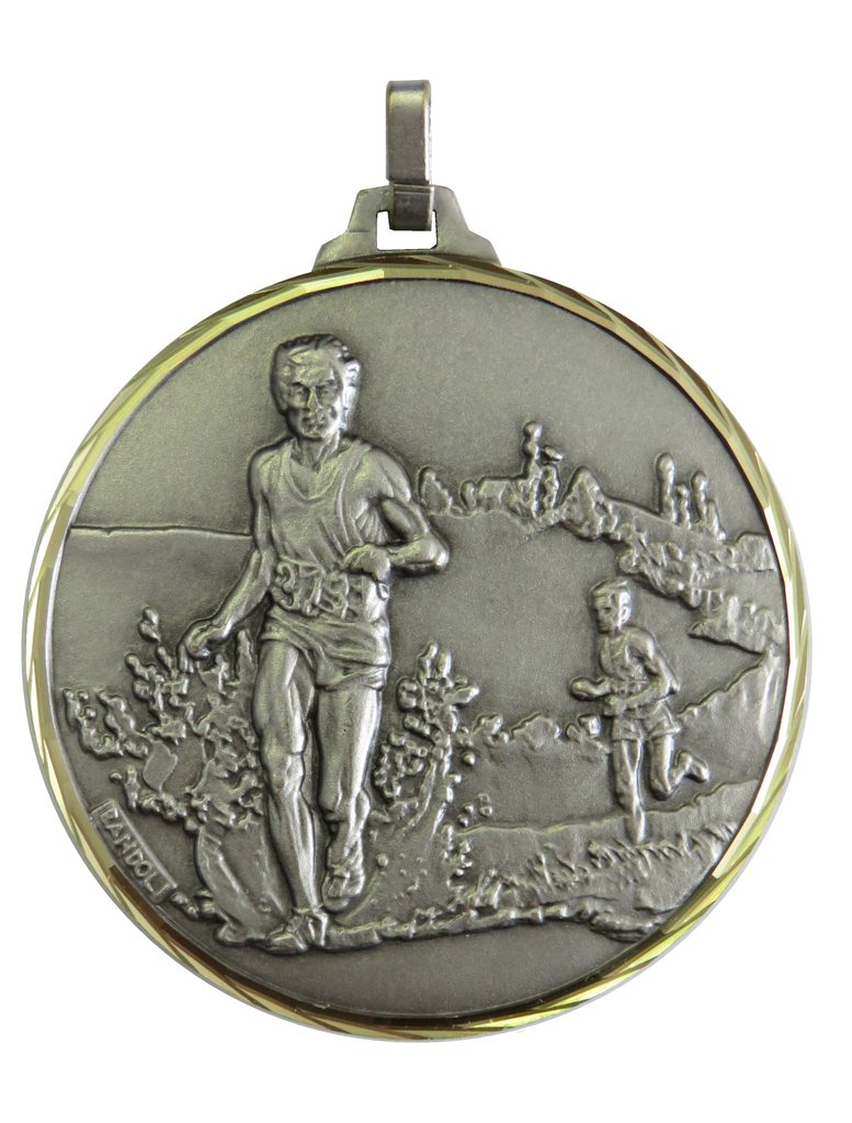 A top quality embossed diamond edged silver cross country running medal made from brass. The medal displays runners in action. Select from 42mm or 52mm diameter and the thickness is 3mm giving the medal a heavy feel. This medal can be engraved on the reverse and comes complete with a loop to accomadate a ribbon.