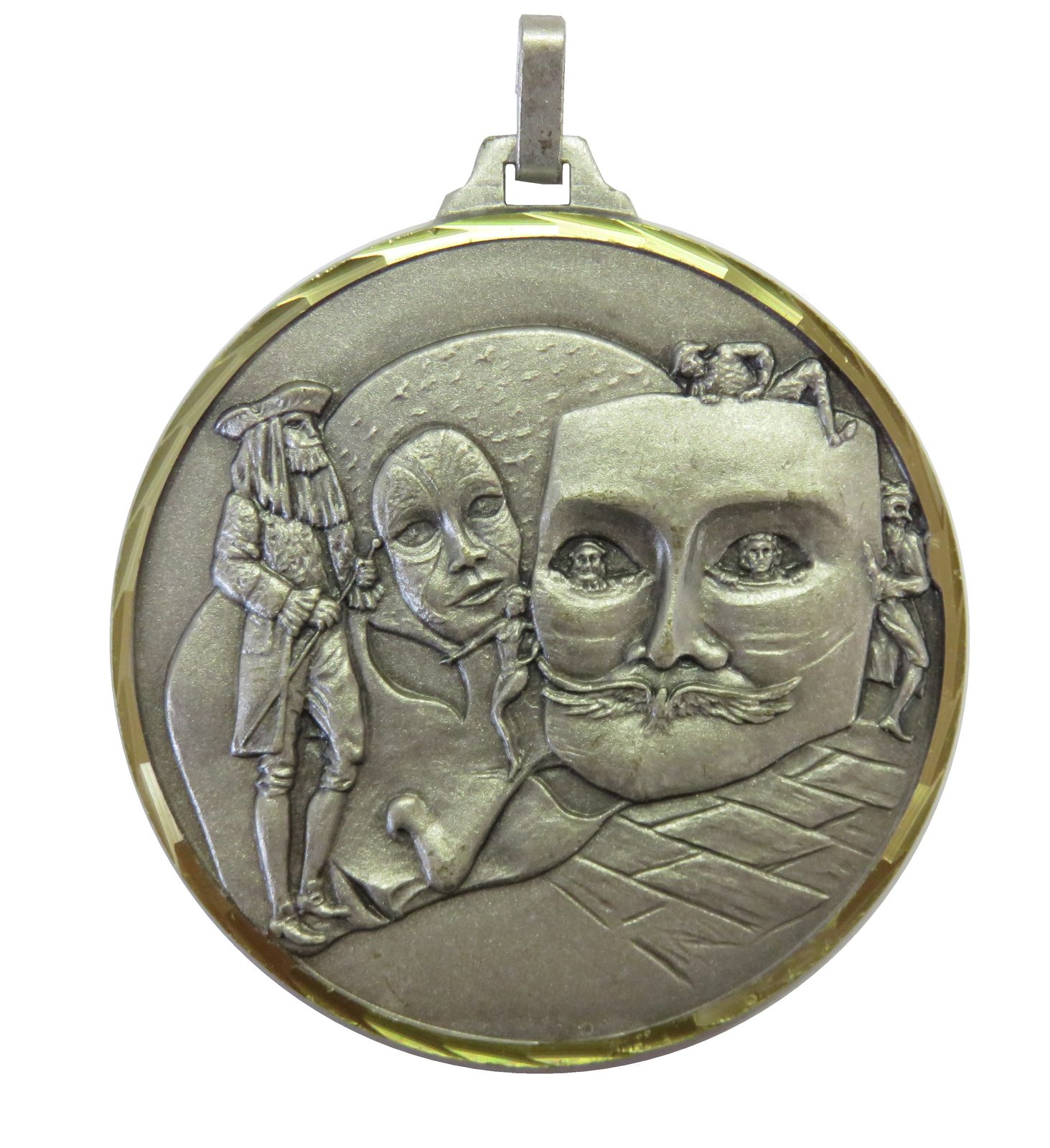 A top quality embossed diamond edged silver drama medal made from brass. The medal displays the tragedy and comedy masks. The diameter is 52mm and the thickness is 3mm giving the medal a heavy feel. This medal can be engraved on the reverse and comes complete with a loop to accomadate a ribbon.