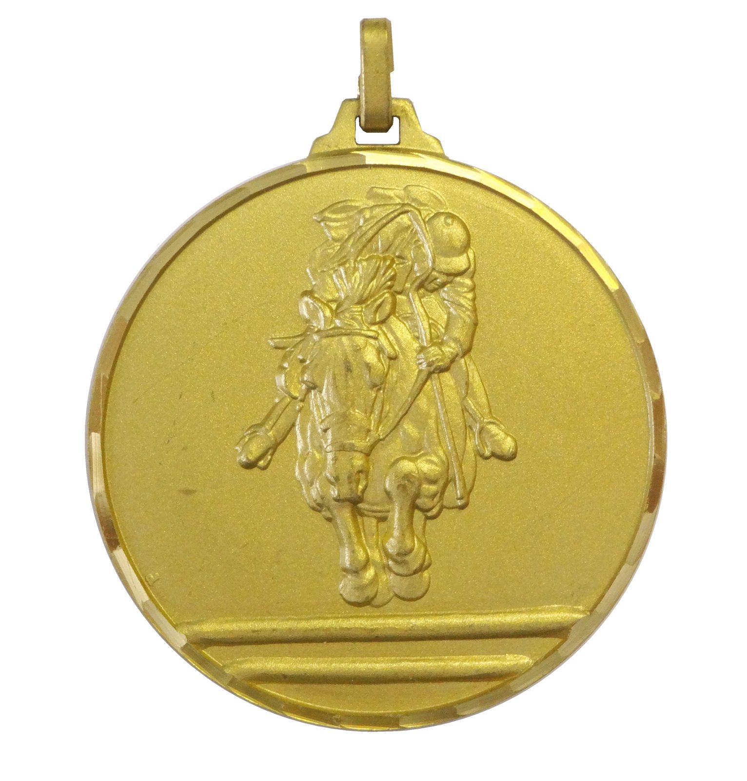 A top quality embossed diamond edged gold equestrian medal made from brass. The medal displays show jumping in action. Select from 42mm or 52mm diameter and the thickness is 3mm giving the medal a heavy feel. This medal can be engraved on the reverse and comes complete with a loop to accomadate a ribbon.