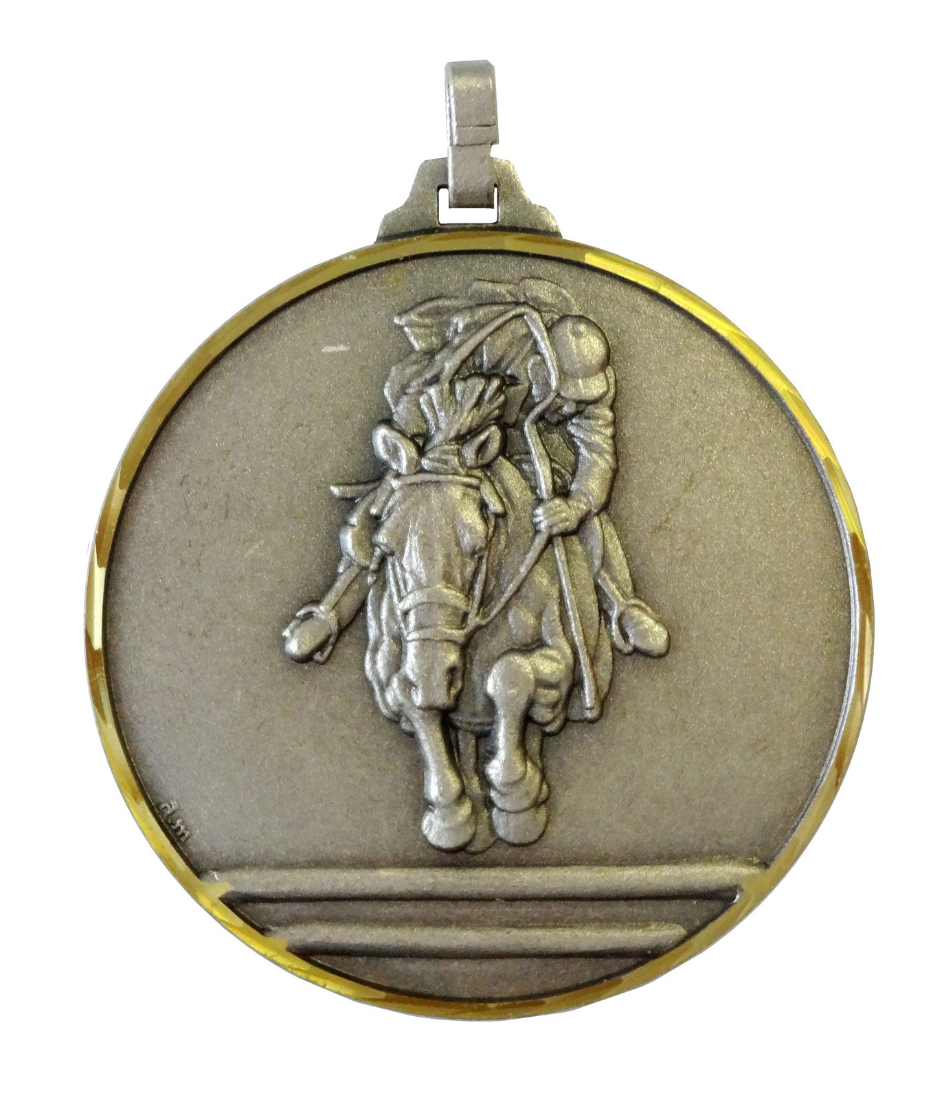 A top quality embossed diamond edged silver equestrian medal made from brass. The medal displays show jumping in action. Select from 42mm or 52mm diameter and the thickness is 3mm giving the medal a heavy feel. This medal can be engraved on the reverse and comes complete with a loop to accomadate a ribbon.