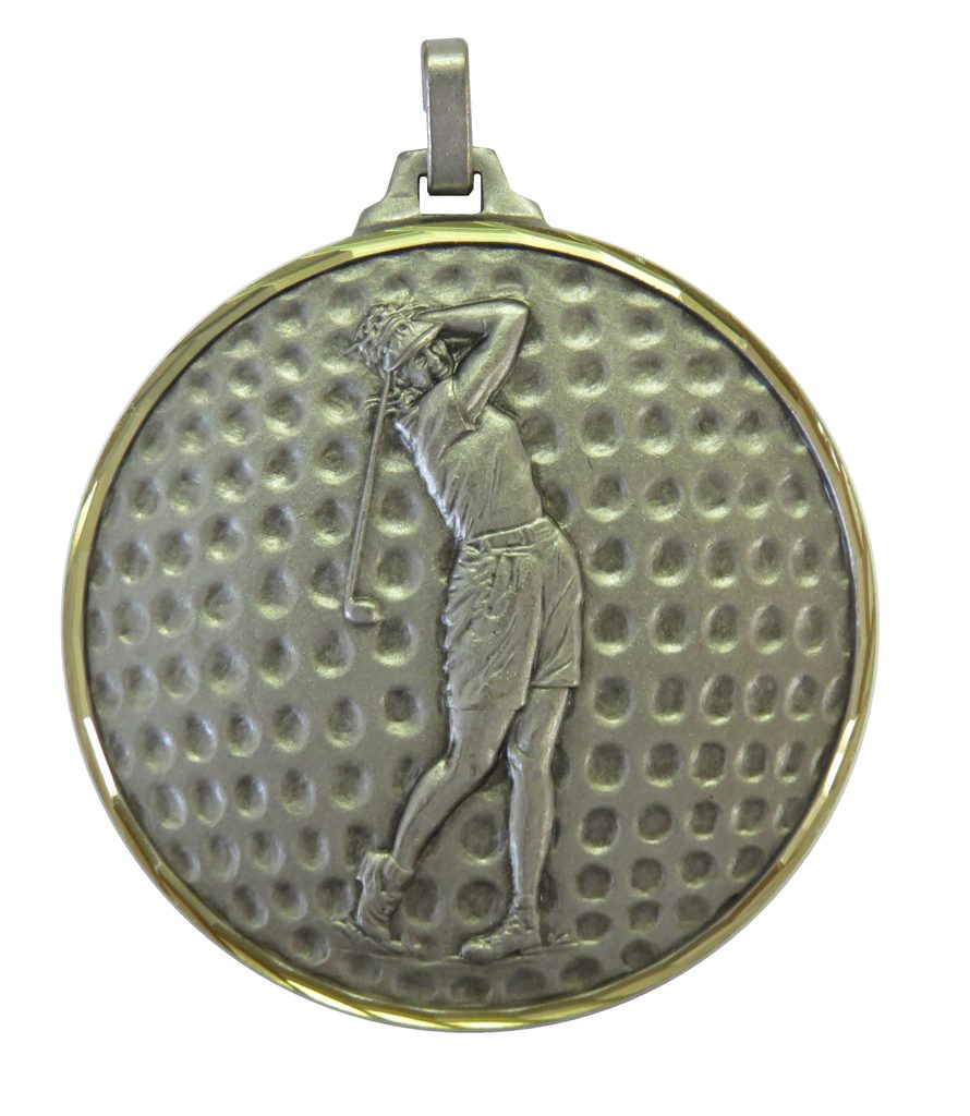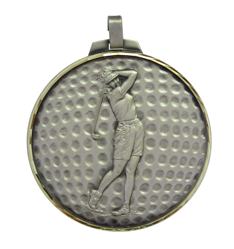 A top quality embossed diamond edged silver female golf medal made from brass. The medal displays a female golfer in action with golf ball background. Select from 42mm, 52mm or 70mm diameter and the thickness is 3mm giving the medal a heavy feel. This medal can be engraved on the reverse and comes complete with a loop to accomadate a ribbon.