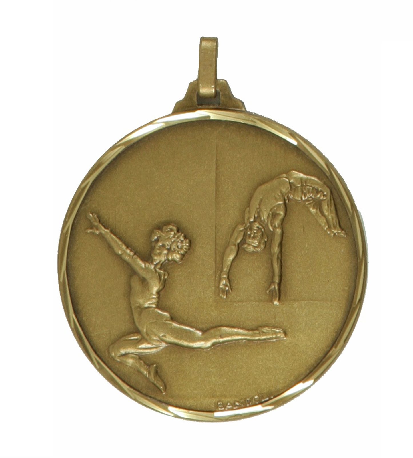 A top quality embossed diamond edged bronze gymnastics medal made from brass. The medal displays a gymnast peforming floor exercises. Select from 42mm or 52mm diameter and the thickness is 3mm giving the medal a heavy feel. This medal can be engraved on the reverse and comes complete with a loop to accomadate a ribbon.